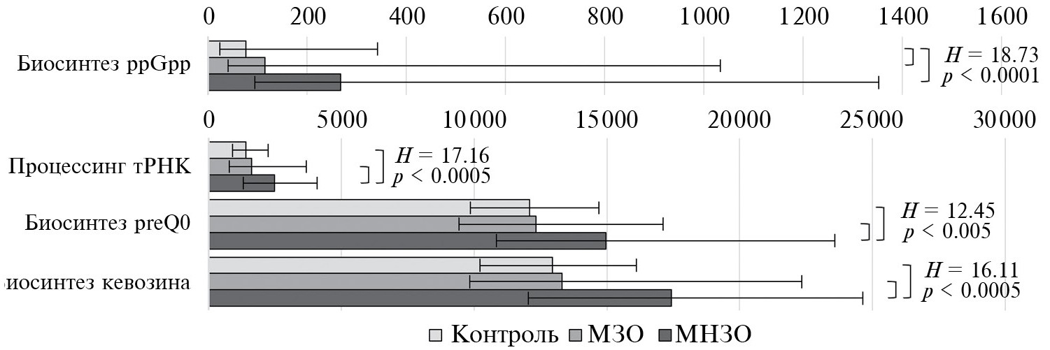 Рис. 6. Анализ путей процессинга нуклеиновых кислот в метаболических профилях микробиома пациентов с МЗО и МНЗО.