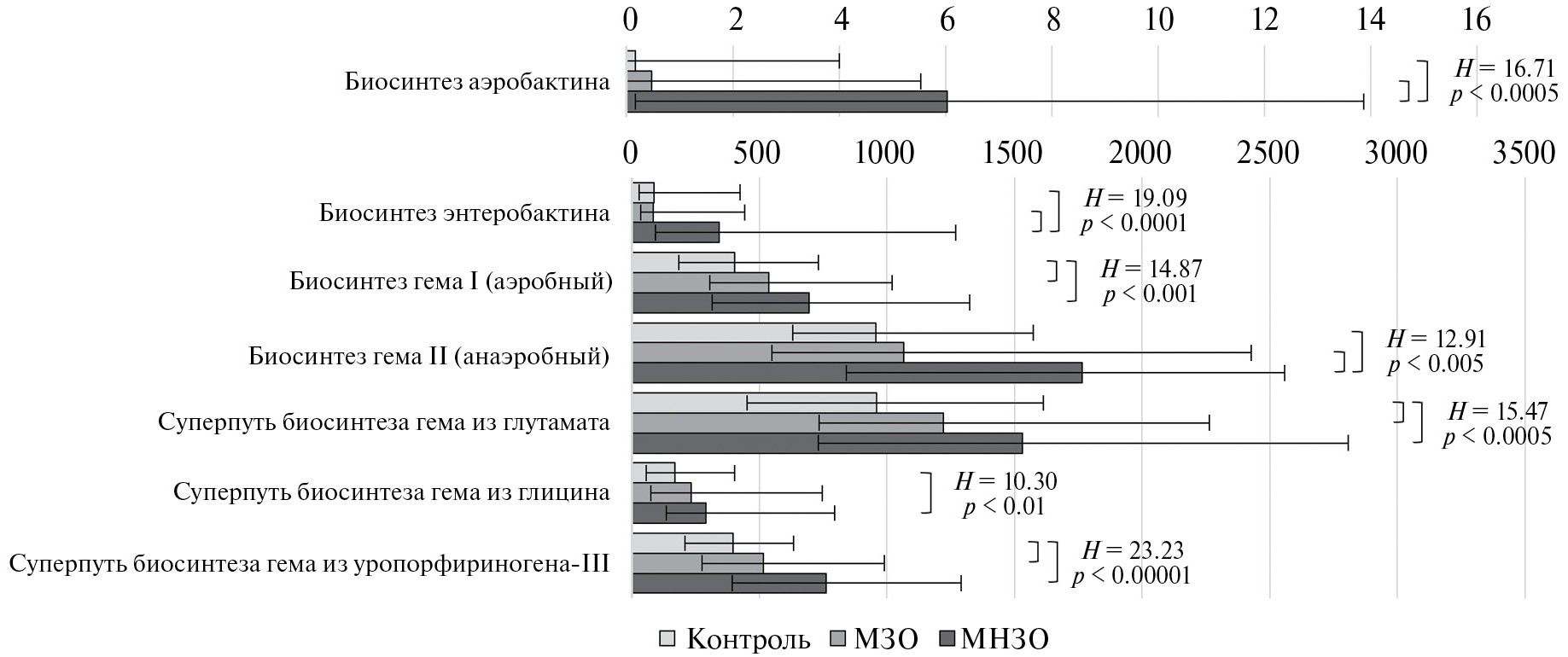 Рис. 7. Анализ путей обмена железа и гема в метаболических профилях микробиома пациентов с МЗО и МНЗО.