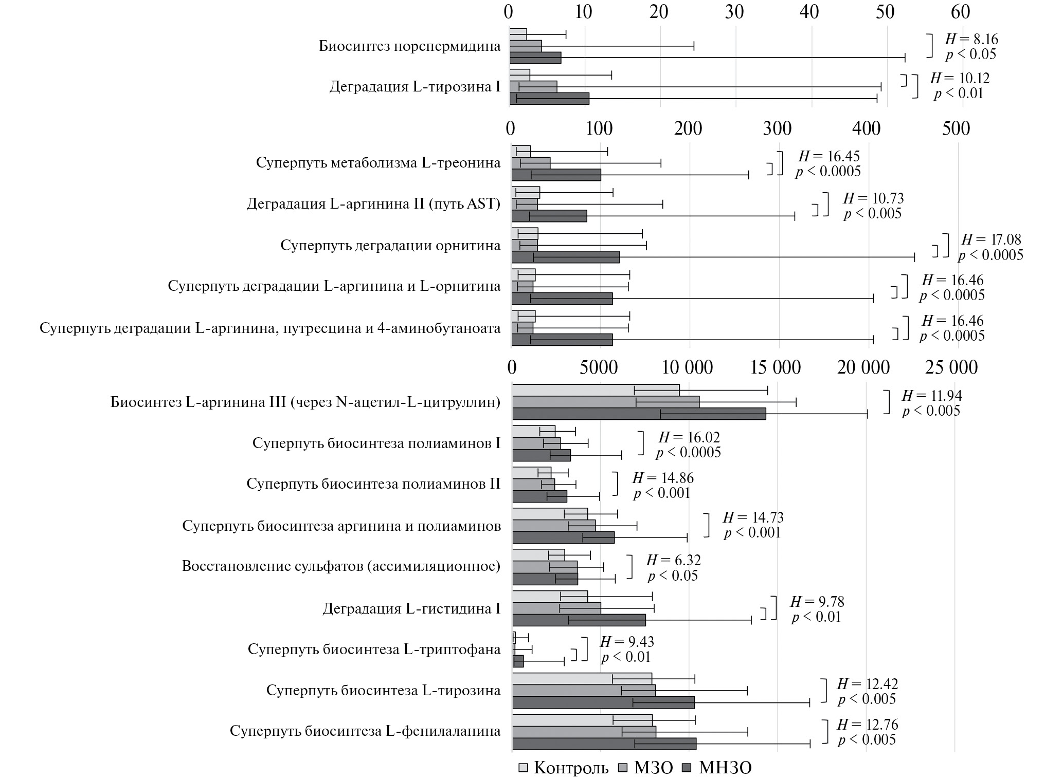 Рис. 8. Анализ путей обмена аминокислот в метаболических профилях микробиома пациентов с МЗО и МНЗО.