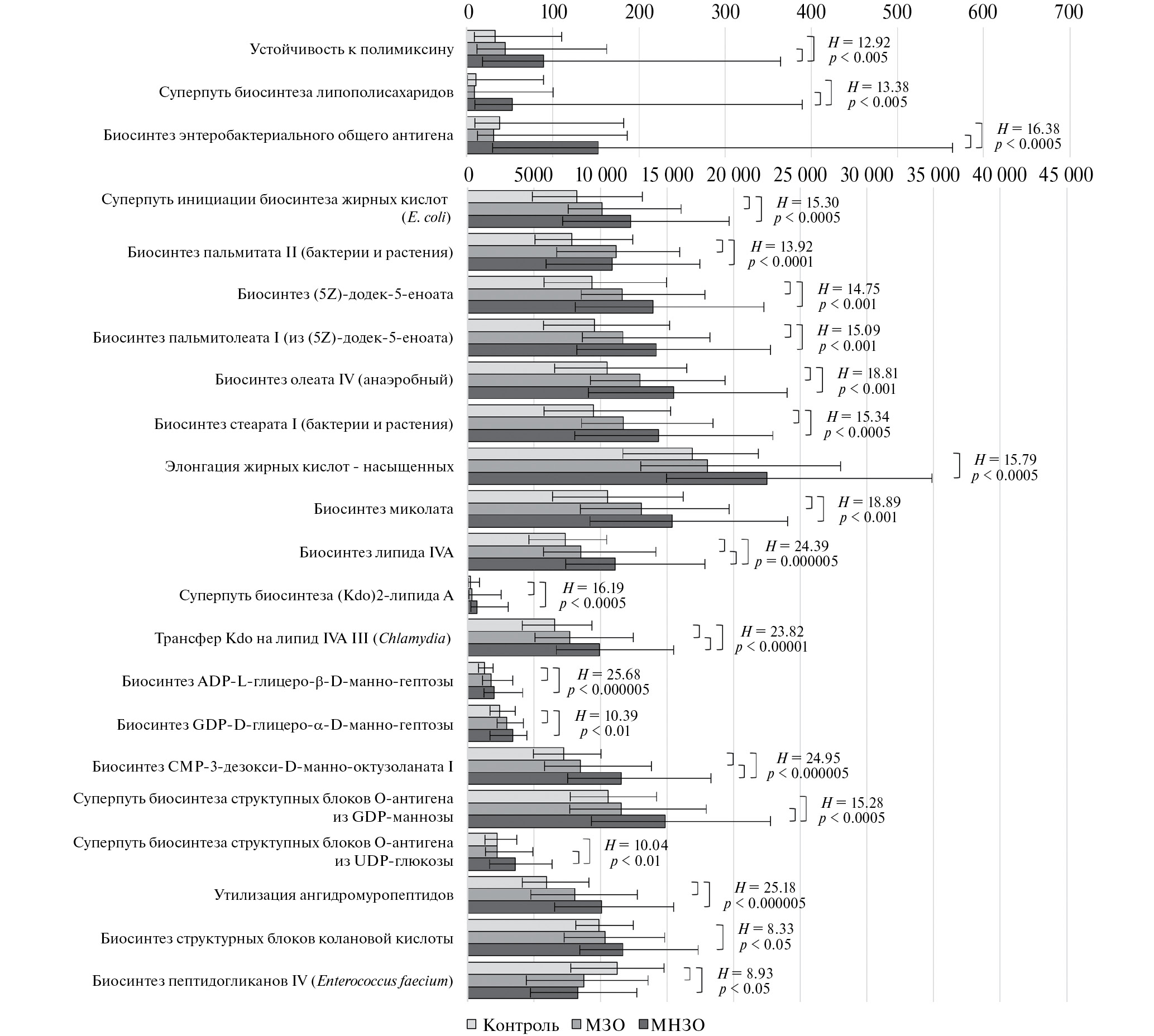 Рис. 10. Анализ путей синтеза структурных компонентов в метаболических профилях микробиома пациентов с МЗО и МНЗО.