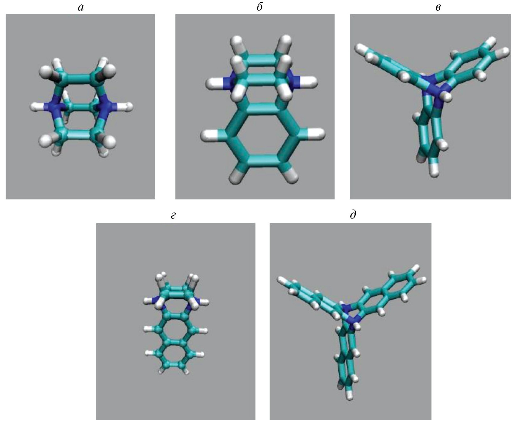 Полициклические производные диазабициклооктана. Полициклические производные молекулы DABCO, рис. 1а, состоят из большего числа атомов, чем исходная молекула, поэтому они могут иметь более сильные Ван-дер-Ваальсовы и электростатические взаимодействия с внутренней поверхностью каналов М2 и E. Рассмотрен набор молекул блокаторов, состоящих из большего числа атомов, чем в молекуле DABCO. Молекулы диазабициклооктанбензола (DABCOB), рис. 1б, и диазабициклооктаннафталина (DABCON), рис. 1 г. Более объемные молекулы, диазабициклооктан-3-бензол (DABCO3B) и диазабициклооктан-3-толуол (DABCO3N), рис. 1в и рис. 1д, получены модификацией циклической структуры корневой молекулы DABCO в трех симметричных направлениях.
