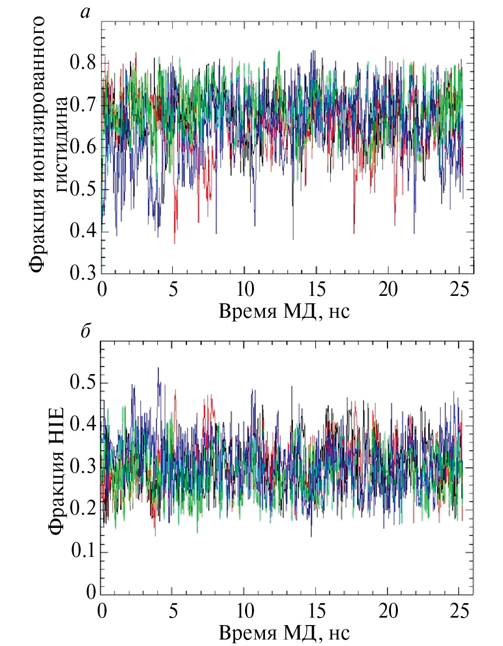 Примечание. Приведена средняя заселенность ионизационных состояний остатков гистидина; в скобках – величины среднеквадратичных (RMSD) флуктуаций.