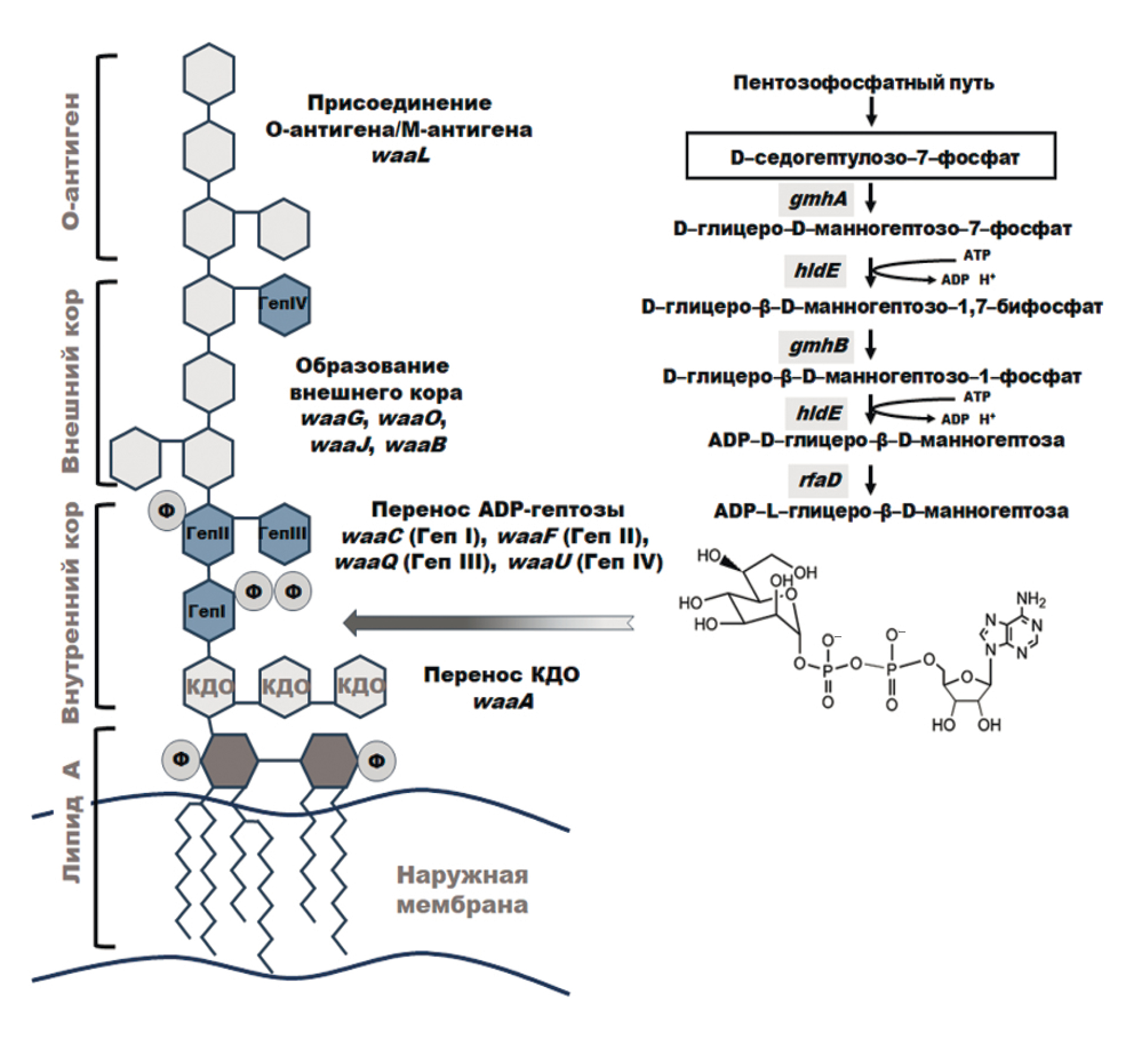 Заключительный этап активации ADP-гептозы с последующим ее переносом на внутренний кор ЛПС осуществляется ферментами, гены которых объединены в первый rfa-оперон, состоящий из rfaD (или gmhD), waaF (или rfaF), waaC (или rfaC) и waaL (или rfaL). RfaD ADP-L-глицеро-D-манногептозо-6-эпимераза осуществляет превращение ADP-D-глицеро-β-D-манногептозы в ADP-L-глицеро-β-D-манногептозу. Гептозилтрансферазы I и II (WaaC и WaaF) переносят первый и второй остатки гептозы на КДО внутреннего кора ЛПС. Ген waaL кодирует лигазу, необходимую для прикрепления О-антигена или альтернативного М-антигена к внешнему кору ЛПС (рис. 2) [21]. Гены первого rfa-оперона находятся под положительным контролем двухкомпонентной системы ZraSR, включающей ZraS – мембраносвязанную сенсорную киназу, и ZraR – регулятор цитоплазматического ответа [25]. Роль системы Zra остается неопределенной: она участвует в ответе на стресс, вызванный действием двухвалентных металлов (в частности, Pb2+, Zn2+, Cu2+) [26], а также на стресс оболочки.