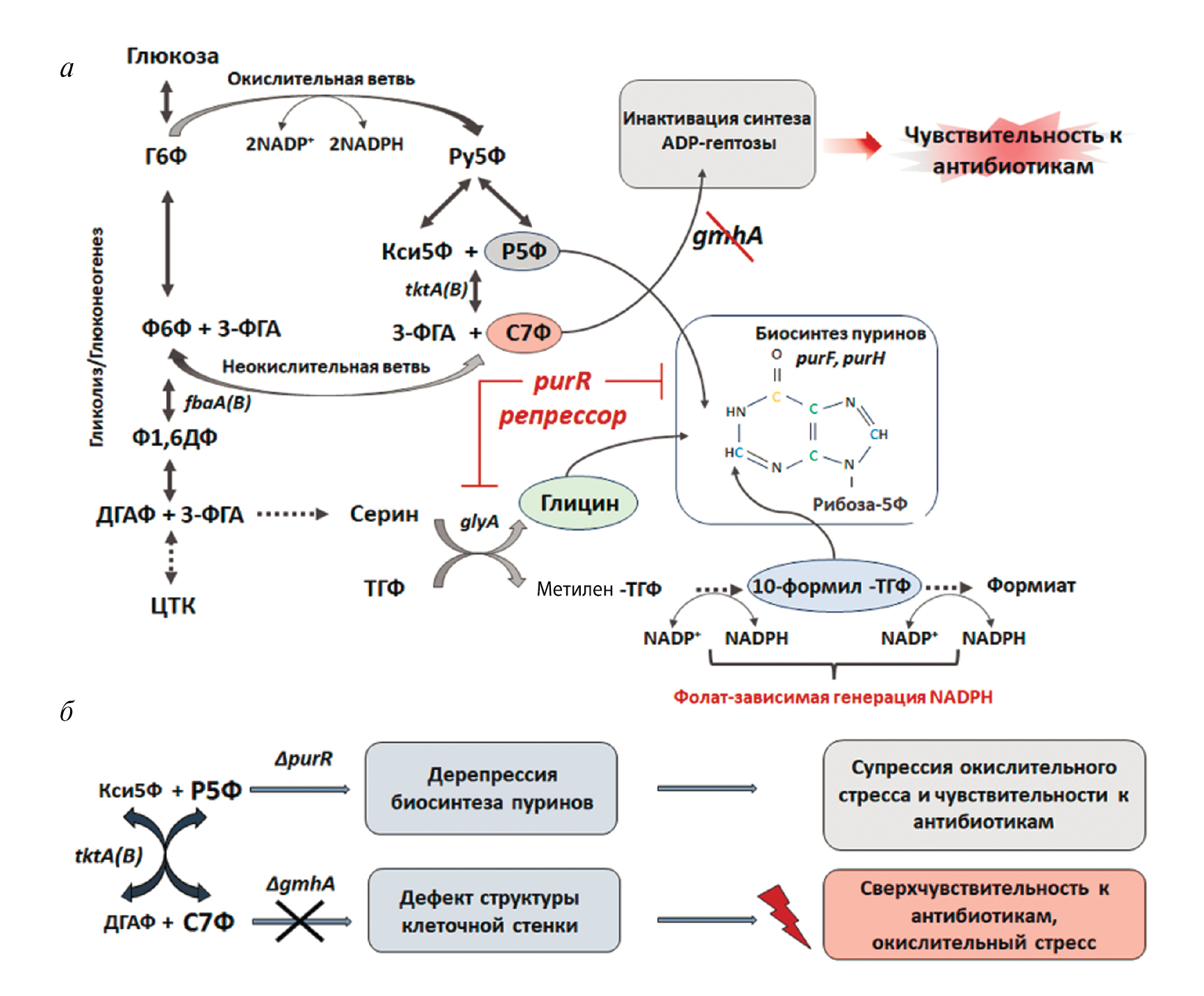Рис. 3. Биосинтез пуринов как фактор, модулирующий чувствительность мутантов по ADP-гептозе. а – Метаболическая схема пентозофосфатного пути, показывающая взаимосвязь процессов синтеза предшественника ADP-гептозы – седогептулозо-7-фосфата, рибозо-5-фосфата и восстановления NADPH. Репрессор PurR регулирует синтез пуринов, начиная с образования фосфорибозилпирофосфата, а также серин-глициновый путь (ген glyA), который наряду с окислительной ветвью пентозофосфатного пути является источником генерации NADPH. б – Инактивация синтеза ADP-гептозы приводит к фенотипу “deep rough”, гиперчувствительности к антибиотикам и окислительному стрессу. Активация биосинтеза пуринов в бактериальных клетках с нарушенным синтезом ADP-гептозы подавляет чувствительность к антибиотикам и окислительный стресс [44], лицензия Creative Commons Attribution (CC BY). Г6Ф – глюкозо-6-фосфат, Ф6Ф – фруктозо-6-фосфат, 3-ФГА – глицеральдегид-3-фосфат, Ф1,6ДФ – фруктозо-1,6-дифосфат, ДГАФ – дигидроксиацетонфосфат, Ру5Ф – рибулозо-5-фосфат, Р5Ф – рибозо-5-фосфат, Кси5Ф – ксилозо-5-фосфат, С7Ф – седогептулозо-7-фосфат, ТГФ –тетрагидрофолат, ЦТК – цикл трикарбоновых кислот.