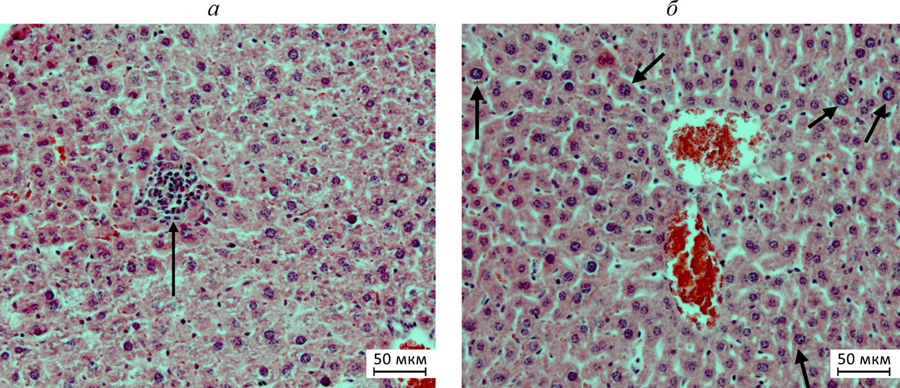 Рис. 2. Фрагменты печени самок мышей контрольной группы. Окраска гематоксилином и эозином. Стрелками указаны: а – мелкий очаг мононуклеарной инфильтрации в паренхиме одной из долей органа (мышь 5.1); б – гипертрофия отдельных гепатоцитов (мышь 5.2).