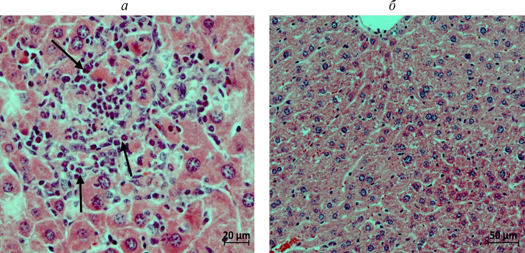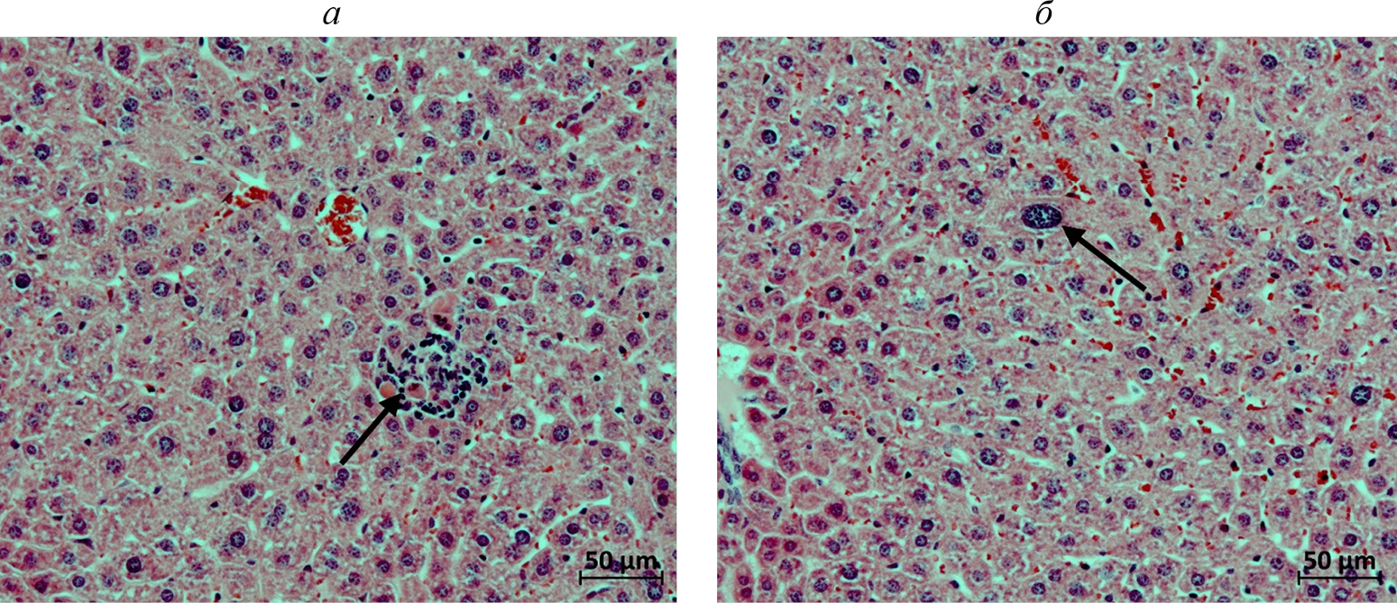 Рис. 4. Фрагменты печени самок мышей на 7-й день после однократного введения 1.5 Ед С115Н-PIC-сом МГЛ / 10 мг метиина. Окраска гематоксилином и эозином. Стрелками указаны: а – мелкие очаги инфильтрации сегментоядерными лейкоцитами (мышь 2.1), б – очаг мононуклеарной инфильтрации с единичными сегментоядерными лейкоцитами и явлениями фагоцитоза погибших гепатоцитов (мышь 2.6).