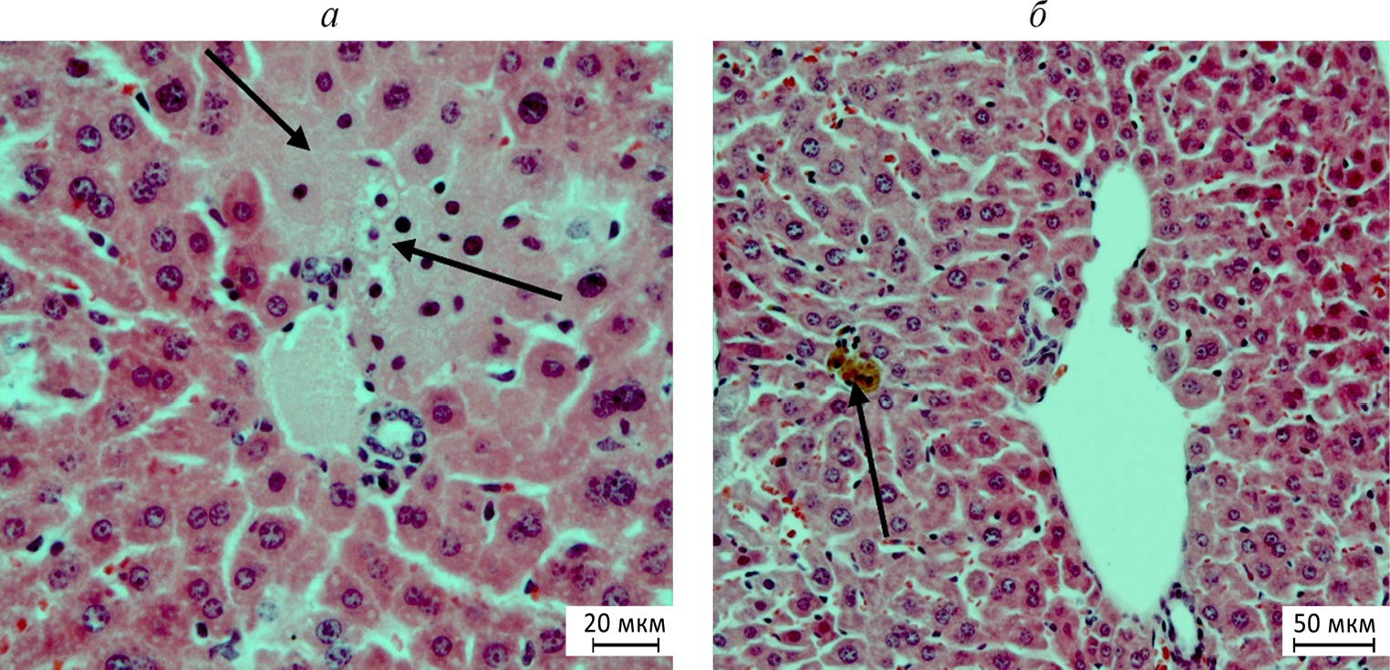 Рис. 5. Фрагменты печени самок мышей на 7-й день после однократного введения 1.5 Ед С115Н-PIC-сом МГЛ/20 мг метиина. Окраска гематоксилином и эозином. Стрелками указаны: а – очаг гепатоцитов с начальными явлениями некроза (мышь 3.4), б – гепатоциты с пигментными включениями в цитоплазме (мышь 3.5).
