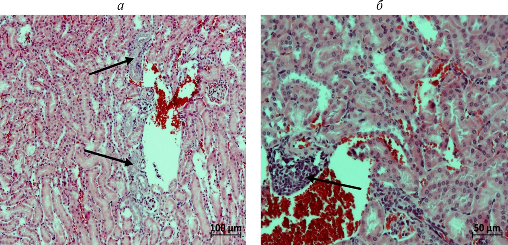 Рис. 8. Фрагменты коркового вещества почки мыши (мышь 3.5) на 7-й день после однократного введения 1.5 Ед С115Н-PIC-сом МГЛ/20 мг метиина. Окраска гематоксилином и эозином. Стрелками указаны: явления хронической прогрессирующей нефропатии (а) и периваскулярный очаг мононуклеарной инфильтрации (б).