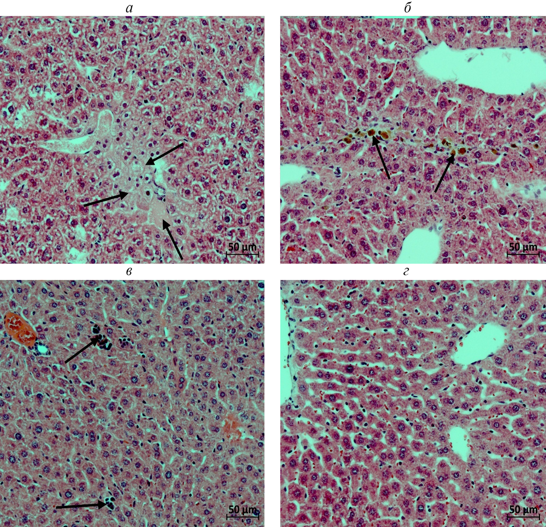 Рис. 10. Фрагменты печени самок мышей на 15-й день после 7-кратного введения 1.5 Ед С115Н-PIC-сом МГЛ/2 мг метиина. Окраска гематоксилином и эозином. Стрелками указаны: а – очаг гепатоцитов с начальными явлениями некроза (мышь 4.1); б – гепатоциты с пигментными включениями в цитоплазме (мышь 4.3); в – мелкие очаги экстрамедуллярного гемопоэза (мышь 4.6); г – обычное гистологическое строение органа (мышь 4.7).