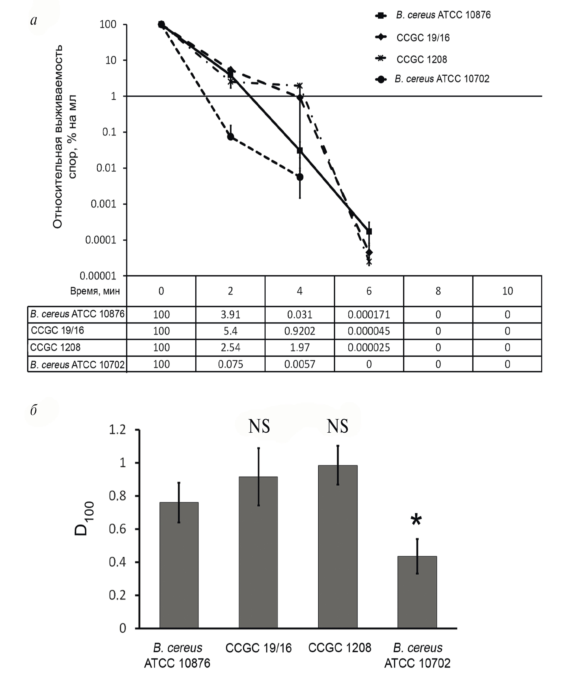 Рис. 3. Оценка термоустойчивости клинических изолятов и эталонных штаммов из группы B. cereus. а — Кривая относительной выживаемости спор. За 100% принято количество жизнеспособных спор в начальной точке. б — Значения D100, вычисленные по данным, представленным на панели а. Значение D100 — время обработки спор (минуты) при 100°C, за которое количество жизнеспособных спор снижается в 10 раз. Разброс данных представлен стандартным отклонением для трех биологических повторов. Статистическая значимость: NS — незначимое отличие, *0.05 > p > 0.01 в соответствии с t-критерием Стьюдента.