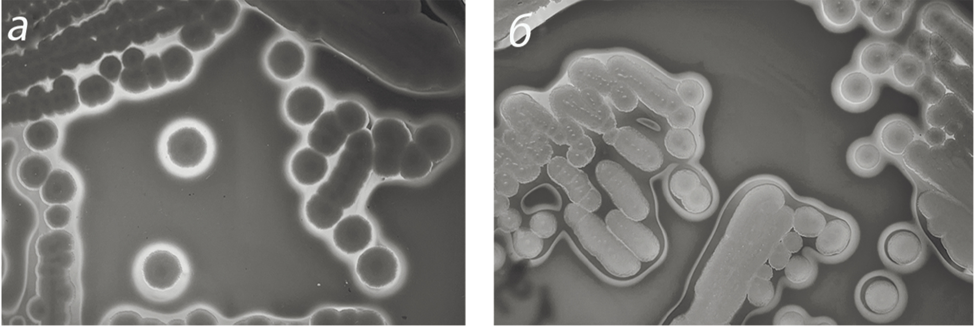 Рис. 5. Оценка размера зон гемолиза у штаммов группы B. cereus. а — Штамм B. cereus ATCC10702, б — Штамм CCGC19/16.