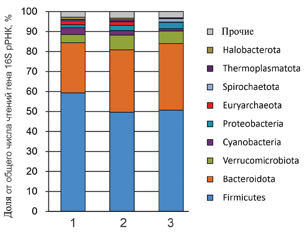 Рис. 1. Таксономический состав микробных сообществ образцов фекалий галловейского КРС (1), яков (2) и “стойлового” КРС (3). На рисунке представлены филумы, средняя доля которых в сообществах составляет не менее 1%.