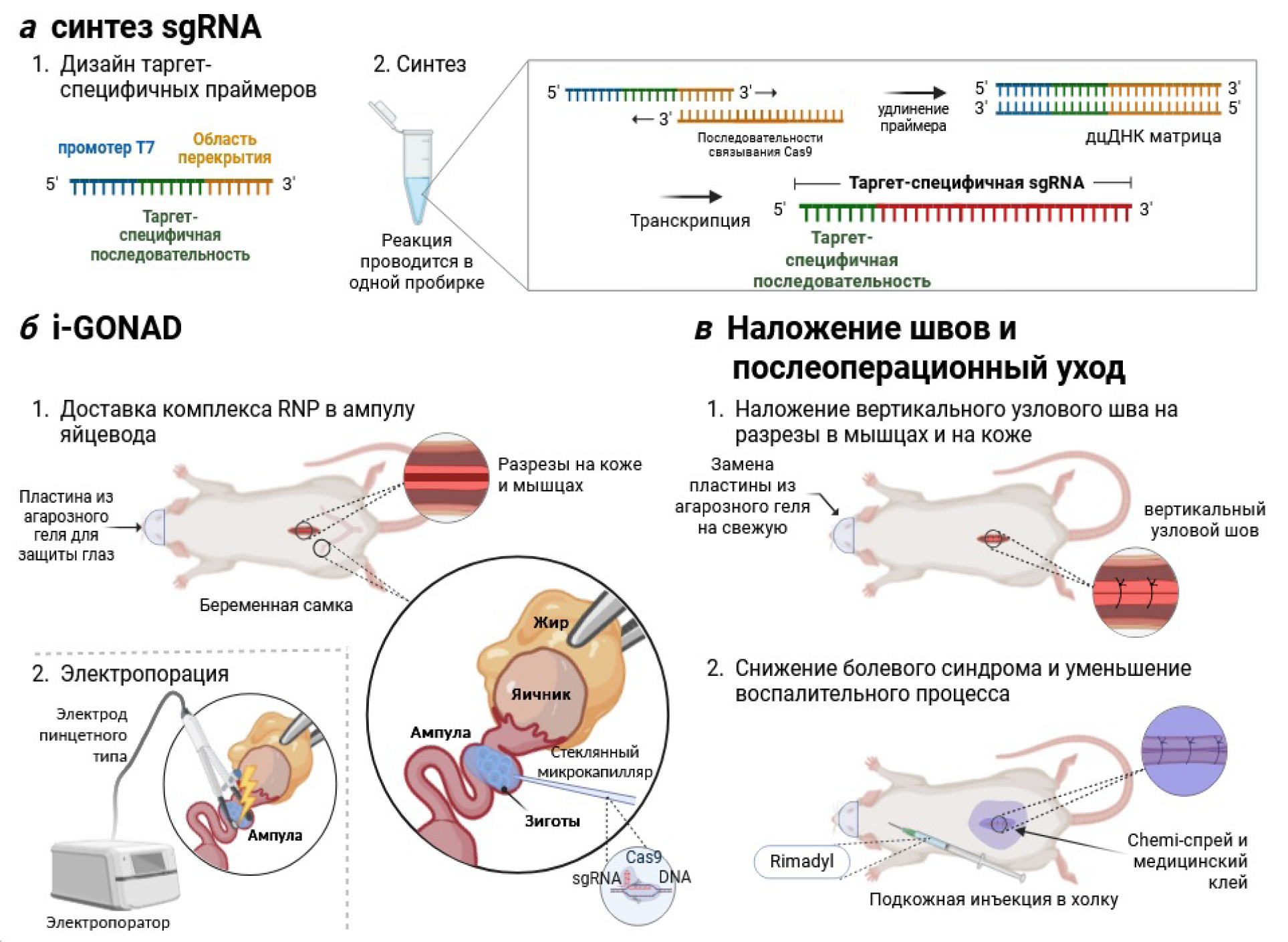 Рис. 1. Схема CRISPR/Cas9 редактирования генома в сочетании с методом i-GONAD. а – Синтез sgRNA (single guide RNA). б – Метод i-GONAD (improved Genome-editing via Oviductal Nucleic Acids Delivery). в – Наложение швов и послеоперационные процедуры. Рисунок создан на сайте biorender.com.