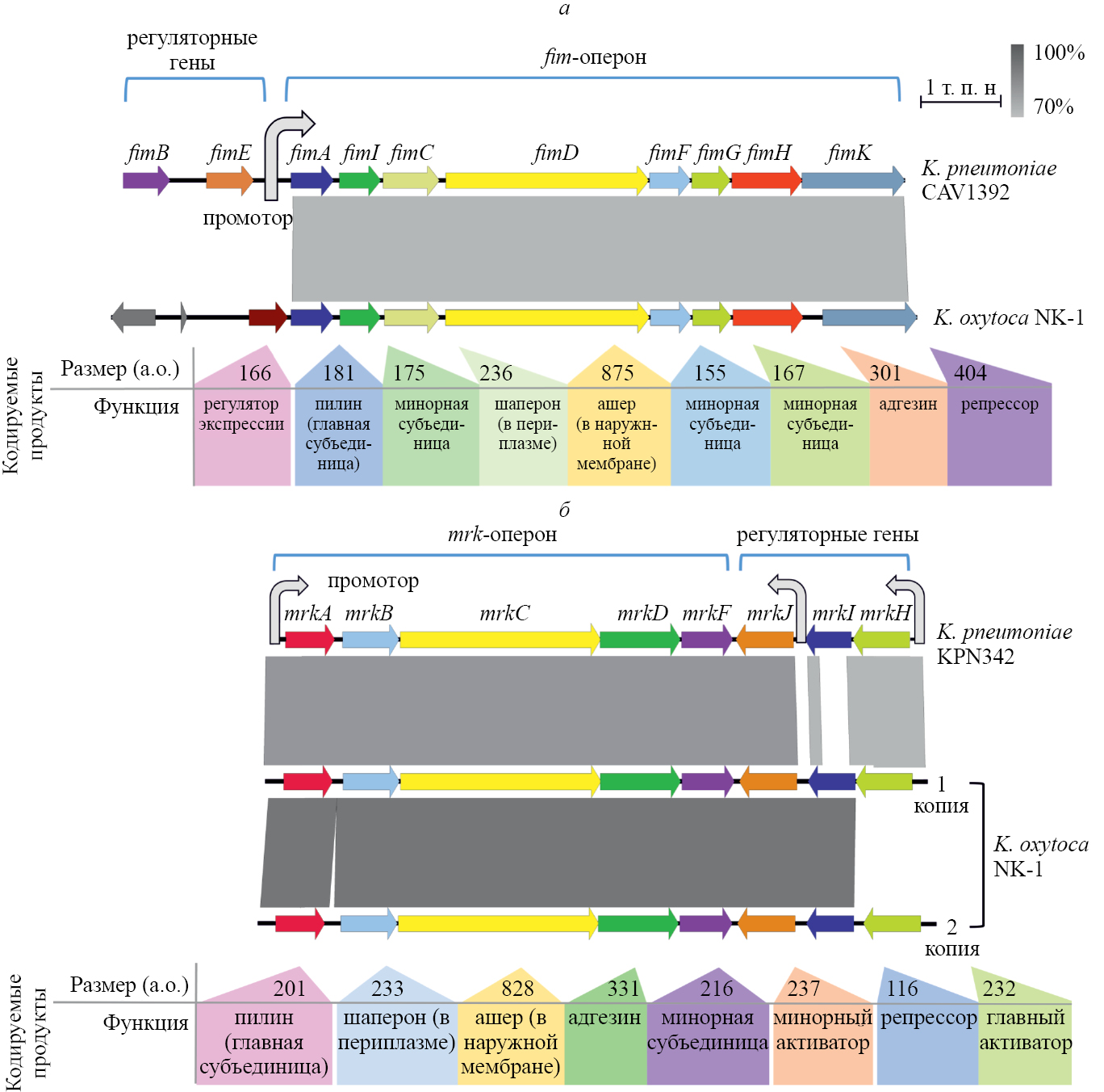 Рис. 2. Сравнительный анализ генных кластеров, ответственных за продукцию фимбрий типа 1 (а) или типа 3 (б), в геномах К. pneumoniae и К. oxytoca. Под генами представлены гипотетические генные продукты в аминокислотных остатках (а.о.). Цветная шкала – степень идентичности сравниваемых генов
