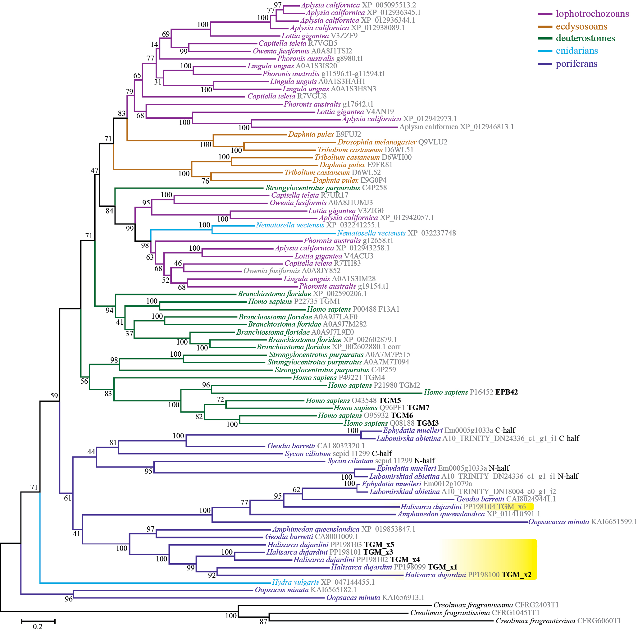 Филогенетический анализ TGM животных. Набор последовательностей для филогенетического анализа TGM составлен на основе ортогрупп, реконструированных ранее с OrthoFinder v.2.5.5 [45]. Ортогруппа, соответствующая семейству TGM животных, была идентифицирована по белкам человека TGM1-7, F13A1 и EPB42. Для расширения таксономического состава TGM губок к последовательностям A. queenslandica и H. dujardinii, имеющимся в ортогруппе, были добавлены TGM, найденные при помощи HMMER v.3.4 [46] в геномных и транскриптомных данных губок Sycon ciliatum, Ephydatia muelleri, и Lubomirskia spp. Также к набору добавлены TGM губок Geodia barretti и Oopsacas minuta, найденные в базе данных NCBI nr при помощи программы blastp из пакета BLAST+ v.2.15. Все собранные последовательности выравнены программой MAFFT v. 7.475 [47] с использованием алгоритма L-INS-i. Последовательности из S. ciliatum, E. muelleri, Lubomirskia spp., у которых обнаружена архитектура со сдвоенным доменом TGM, были разделены на две части (N и C) для филогенетического анализа. Перед построением дерева из выравнивания при помощи программы trimAl v.1.2 были удалены участки, содержащие >70% пробелов [48]. Реконструкция филогенетического дерева выполнена методом максимального правдоподобия при помощи пакета IQ-TREE v.1.6.12 [49]: эволюционная модель для реконструкции (LG+R7) выбрана автоматически с помощью ModelFinder [50], поддержка узлов дерева оценена с использованием метода сверхбыстрого бутстрэпа UFBoot [51] с 1000 реплик. Построенное дерево визуализировано в программе MEGA v.7.0.21 [52].