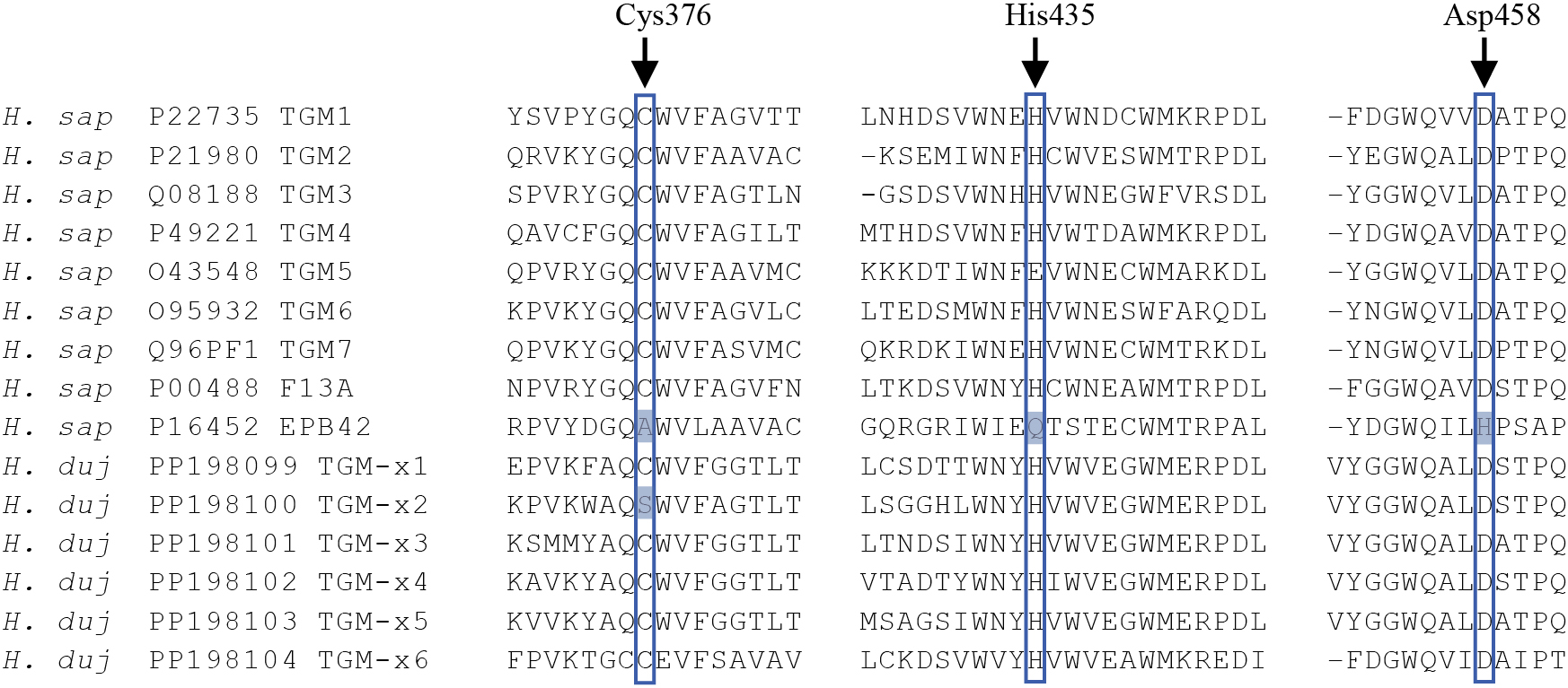 Рис. 4. Выравнивание аминокислотных последовательностей каталитических сайтов TGM H. dujardinii и человека. Стрелками и рамками выделены каталитические остатки цистеина 376 (Cys376), гистидина 435 (His435) и аспарагиновой кислоты 458 (Asp458), необходимые для каталитической активности. Голубым показаны замены ключевых аминокислот. Нумерация приведена для TGM1 H. sapiens.