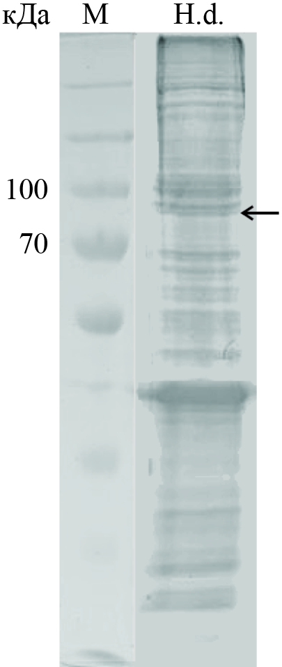 Рис. 5. Электрофоретический анализ белков в 10%-ном SDS-ПААГ, окрашивание Coomassie R250. М – маркер молекулярной массы; H. d. – осветленный гомогенат клеточной суспензии H. dujardinii. Стрелкой показана зона, использованная для идентификации TGM H. dujardinii методом масс-спектрометрии.