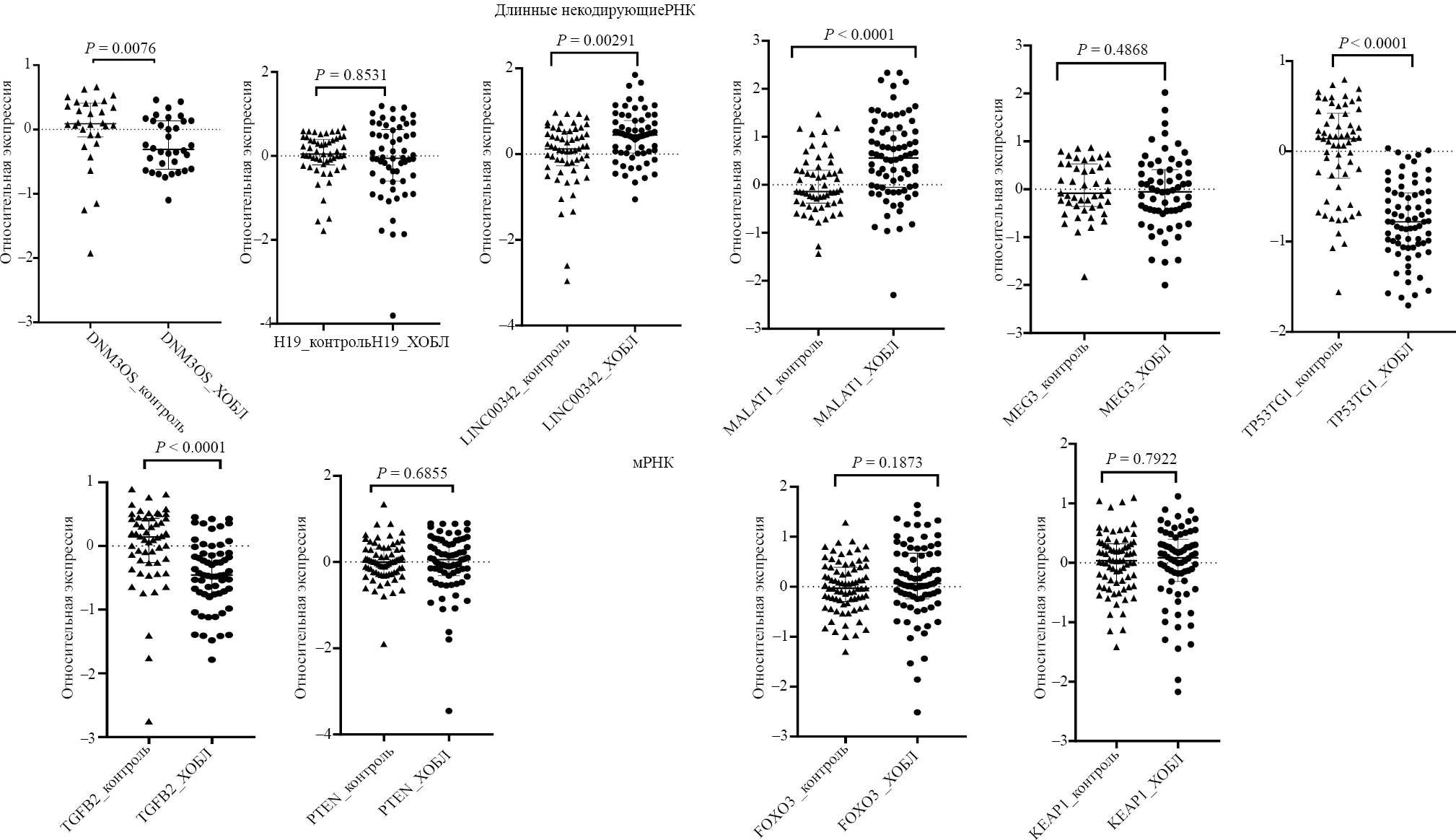 Нами определен уровень относительной экспрессии днРНК (TP53TG1, LINC00342, H19, MALAT1, DNM3OS, MEG3) и мРНК (PTEN, TGFB2, FOXO3, KEAP1) в МНК больных ХОБЛ и здоровых индивидов. Результаты представлены в табл. 4 и на рис. 1.