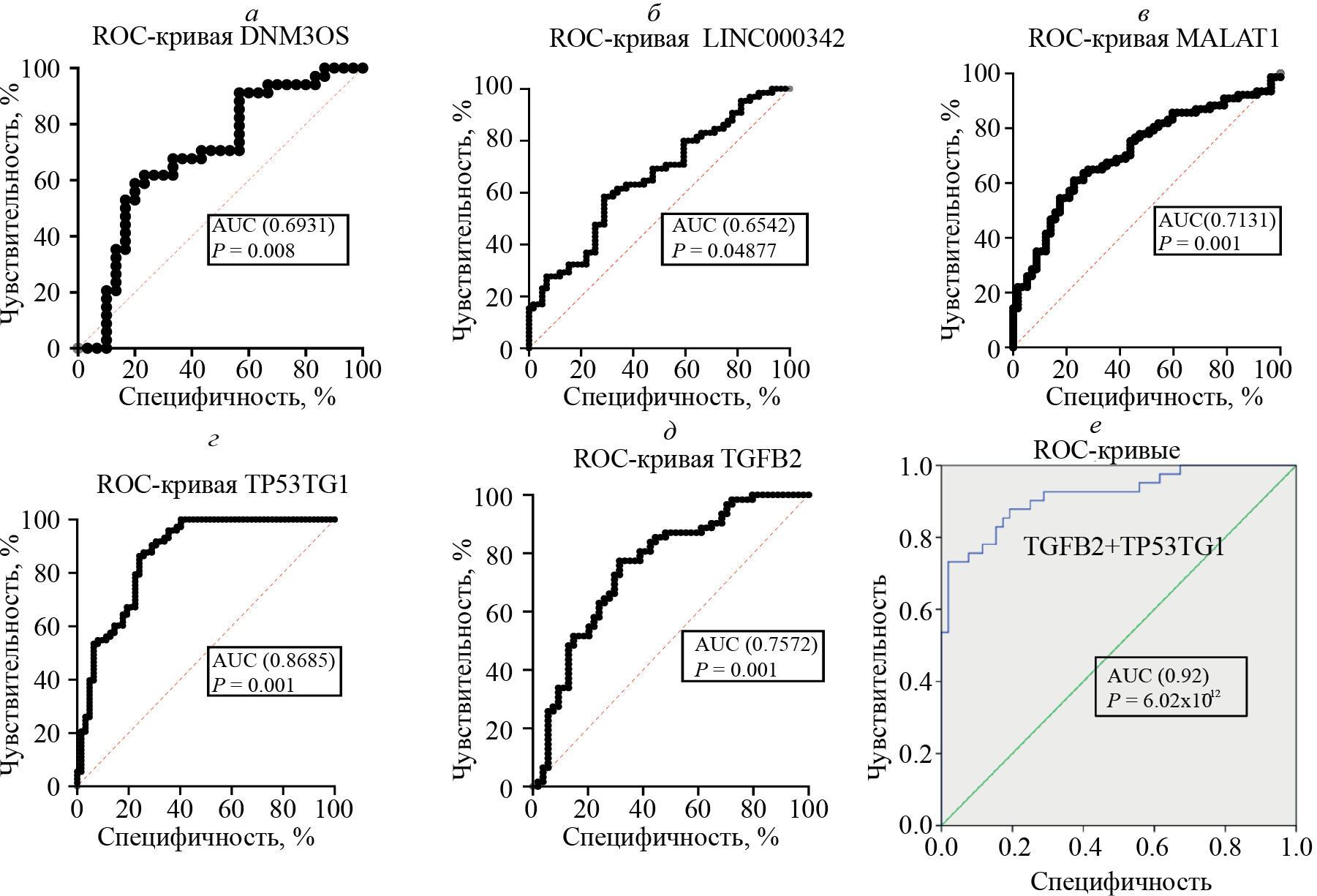 Синтез кДНК и анализ экспрессии днРНК и мРНК. кДНК cинтезировали с помощью набора First Strand cDNA Synthesis Kit for RT-qPCR (“Thermo Fisher Scientific”) в соответствии с протоколом производителя с использованием гексамерного рандомного праймера. Для синтеза кДНК матрицы РНК выравнивали до концентрации 100 нг/мкл, реакцию проводили в объеме 20 мкл в следующих условиях: матрица РНК – 3 мкл, рандомный праймер – 1 мкл, 5× реакционный буфер (250 мM Tрис-HCl pH 8.3, 250 мM KCl, 20 мM MgCl2, 50 мM DTT) – 4 мкл, ингибитор РНКаз RiboLock (20 ед./мкл) – 1 мкл, 10 мM смесь dNTP – 2 мкл, обратная транскриптаза RevertAid M-MuLV RT (200 ед./мкл) – 1 мкл, вода, свободная от нуклеаз, до объема 20 мкл. Затем смесь инкубировали при 25°C – 5 мин, 42°C – 60 мин, 70°C – 5 мин. Продукт ОТ-реакции хранили при –70°C до проведения количественной ПЦР. Количественную ПЦР проводили в 96-луночном планшете с использованием qPCRmix-HS Master Mix (“Evrogen”, Россия, https://evrogen.ru) на приборе QuantStudio 5 (“Applied Biosystems”, CША). По результатам биоинформатического поиска для анализа были выбраны следующие днРНК и белоккодирующие гены: TP53TG1, LINC00342, H19, MALAT1, DNM3OS, MEG3, PTEN, TGFB2, FOXO3, KEAP1. Уровни экспрессии целевых генов определяли с использованием наборов ген-специфических праймеров (концентрация 10 нг/мкл) и флуоресцентных зондов (10 нг/мкл), дизайн и синтез которых осуществлен компанией “ДНК-Синтез” (Россия). В табл. 2 представлена характеристика выбранных генов. В качестве внутреннего контроля использовали ген домашнего хозяйства B2M (ID567). Уровень мРНК B2M определяли с помощью ген-специфичных праймеров и зонда (Hs00187842m1, “Thermo Fisher Scientific”). ОТ-ПЦР проводили в трех повторах для каждого образца в следующих условиях: 3 мин при 95°C для начальной активации ПЦР, 15 с при 95°C – денатурация и амплификация в течение 1 мин при 60°C (45 циклов). Качество контролировали с использованием положительного (предоставлен разработчиком набора) и отрицательного контроля (не содержащего кДНК).