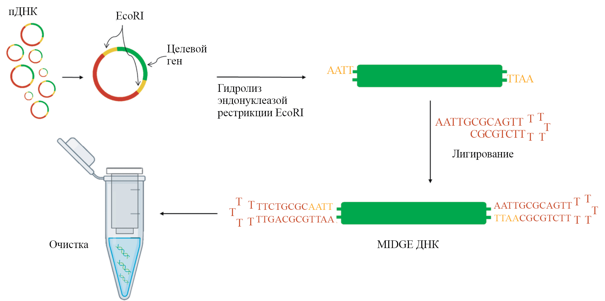 MIDGE ДНК (аббревиатура от Minimalistic Immunogenically Defined Gene Expression) представляет собой линейную двухцепочечную ДНК, состоящую из промотора, целевого гена и РНК-стабилизирующих последовательностей, которые в свою очередь окружены двумя короткими олигонуклеотидными последовательностями в виде шпилек, образующих ковалентно замкнутую молекулу в форме гантели. Такой подход к конструированию ДНК-вакцин позволяет свести некодирующую часть целевого гена к минимуму (рис. 4). Технология получения таких конструкций состоит из нескольких этапов: 1) наработка плазмидной ДНК, содержащей в своем составе экспрессионную кассету, фланкированную сайтами узнавания эндонуклеаз рестрикции; 2) обработка плазмидной ДНК эндонуклеазой рестрикции с образованием одноцепочечных липких концов; 3) лигирование липких концов экспрессионной кассеты с заранее синтезированными олигонуклеотидами, формирующими шпилечную структуру; 4) очистка линейной ДНК от побочных продуктов.