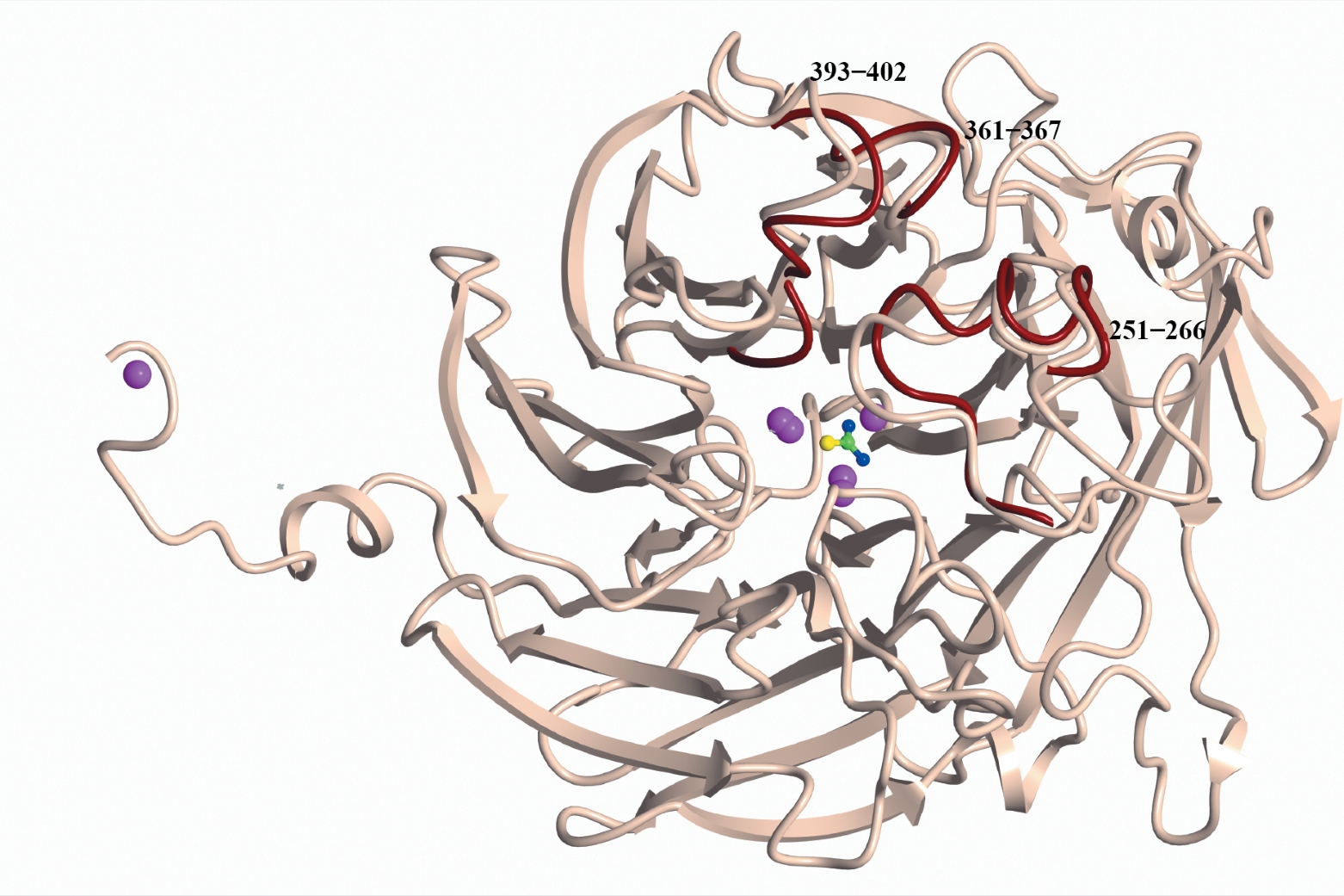Качество электронной плотности позволяет также выделить в структурах свободного фермента по два состояния как в “открытой”, так и в “закрытой” конформациях субъединицы, включающие ионы меди с частичной заселенностью и соответствующие лиганды.