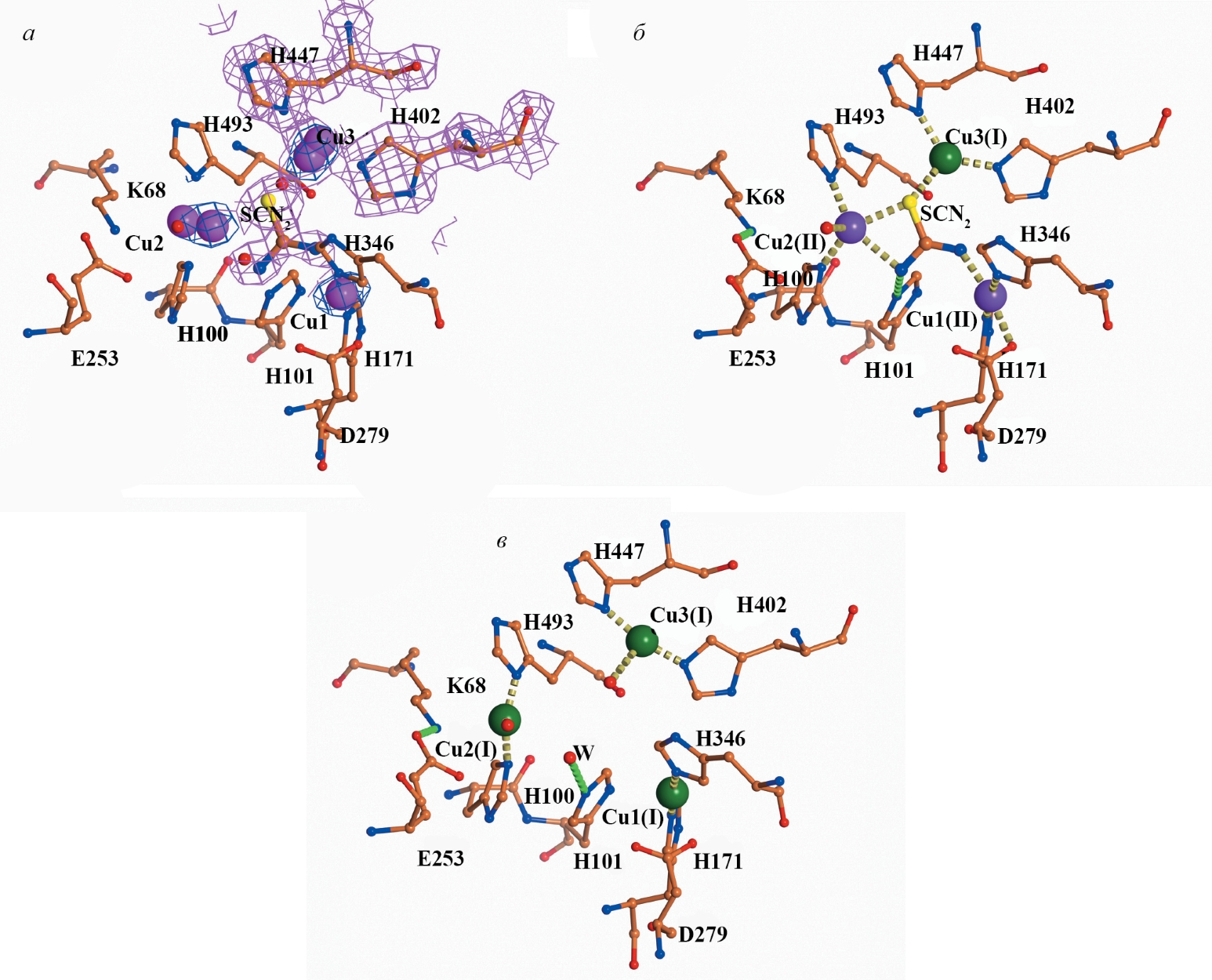В структуре комплекса с тиомочевиной в “открытой” конформации можно также выделить два состояния активного центра фермента. В этих структурах субстратный канал открыт, а в активном центре наблюдаются только кислородные лиганды. Заселенность первого состояния составляет 0.35 (рис. 4а). Ион Cu1(II) координирован пятью лигандами по типу тригональной бипирамиды, образованной атомами NE2 H171, NE2 H346, OD2 D279 и двумя молекулами воды. Ион Cu2(II) также координирован пятью лигандами по типу тригональной бипирамиды, сформированной атомами ND1 H493, NE2 H100, NZ K68 и двумя молекулами воды. Ион Cu3(I) координирован тремя лигандами по типу плоского треугольника: атомами NE2 H402, ND1 H447 и молекулой воды. В “открытой” конформации на месте ингибитора тиомочевины в структуре комплекса находятся три кислородных лиганда. Одна молекула воды расположена на месте атома N1 тиомочевины, вторая — на месте атома S, третья — на месте атома N2.