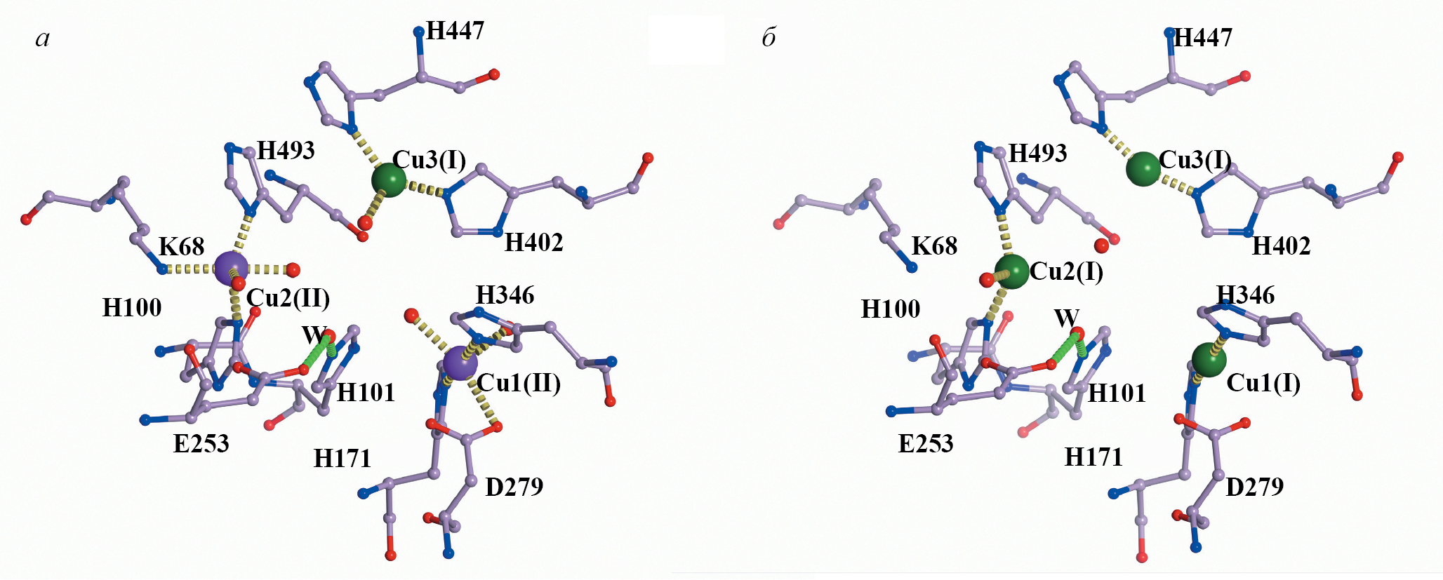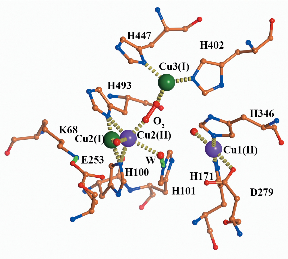 Модель структуры активного центра субъединицы в “закрытой” конформации показана на рис. 5. Первое состояние включает молекулярный кислород и три иона меди с соответствующими лигандами с заселенностью q = 0.7. Ион Cu1(II) координирован четырьмя лигандами (NE2 H171, NE2 H346, OD1 D279 и молекулой воды) по типу плоского квадрата. Ион Cu2(II) координирован пятью лигандами по типу трехгранной бипирамиды. Координация включает атомы ND1 H493, NE2 H100, О молекулярного кислорода, две молекулы воды (включая W). Ион Cu3(I) координирован тремя лигандами (NE2 H402, ND1 H447, О молекулярного кислорода) по типу плоского треугольника.