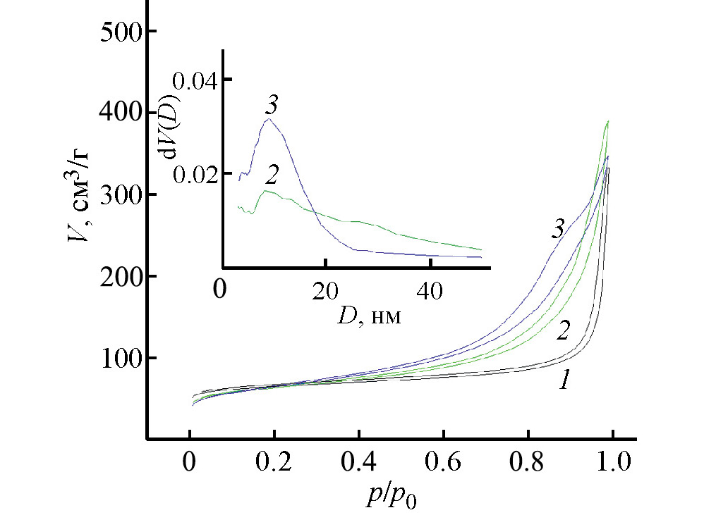 Текстурные характеристики исследовали методом низкотемпературной адсорбции азота при −196°С с помощью Autosorb-6B-Kr (Quantachrome Instruments, США). Перед измерением все образцы подвергали термической дегазации при 350°С в течение 4 ч, а образцы катализаторов предварительно прокаливали при 400°С для удаления хелатирующего агента. Удельную площадь поверхности (SБЭТ) рассчитывали по методу БЭТ, объем микропор (Vмикро) оценивали с помощью t-метода.