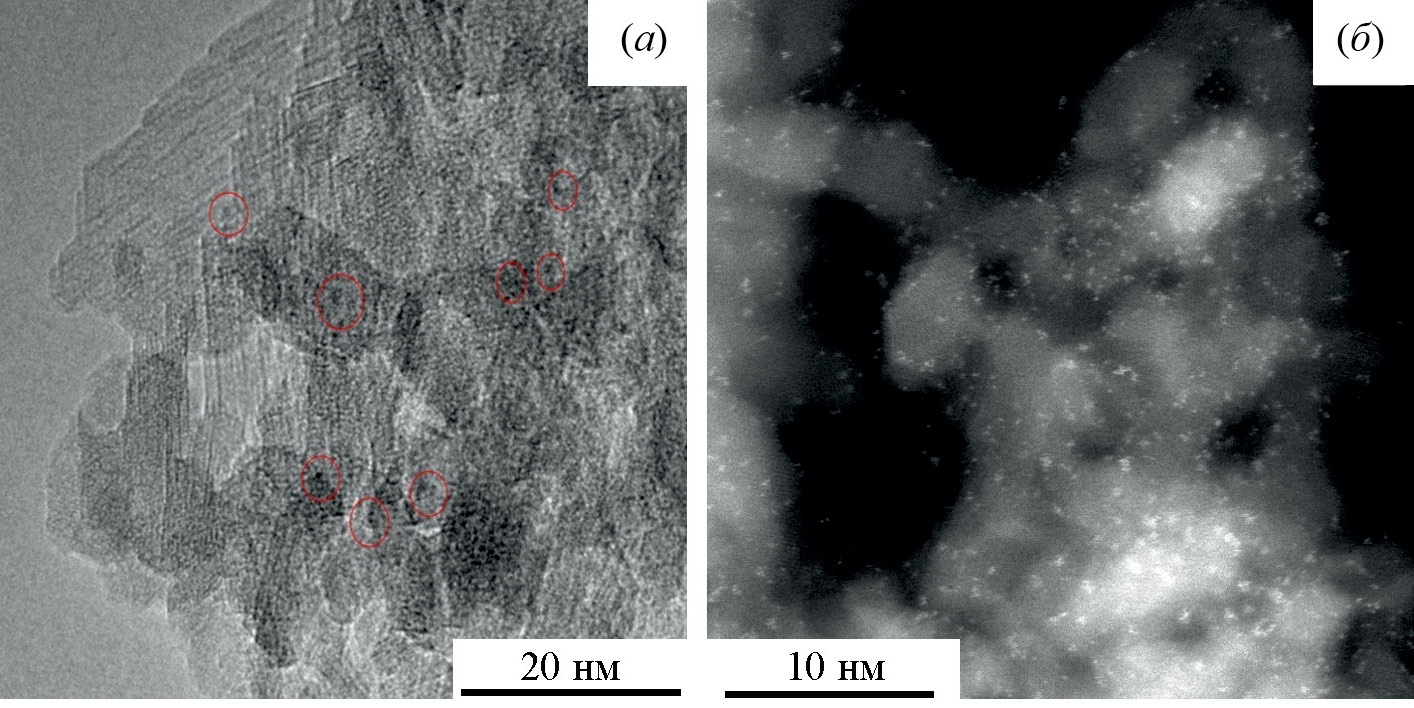 Рис. 1. Данные просвечивающей электронной микроскопии по распределению нанесенных активных частиц Pt–Sn (а) и W (б) на поверхности соответствующих конвертеров.