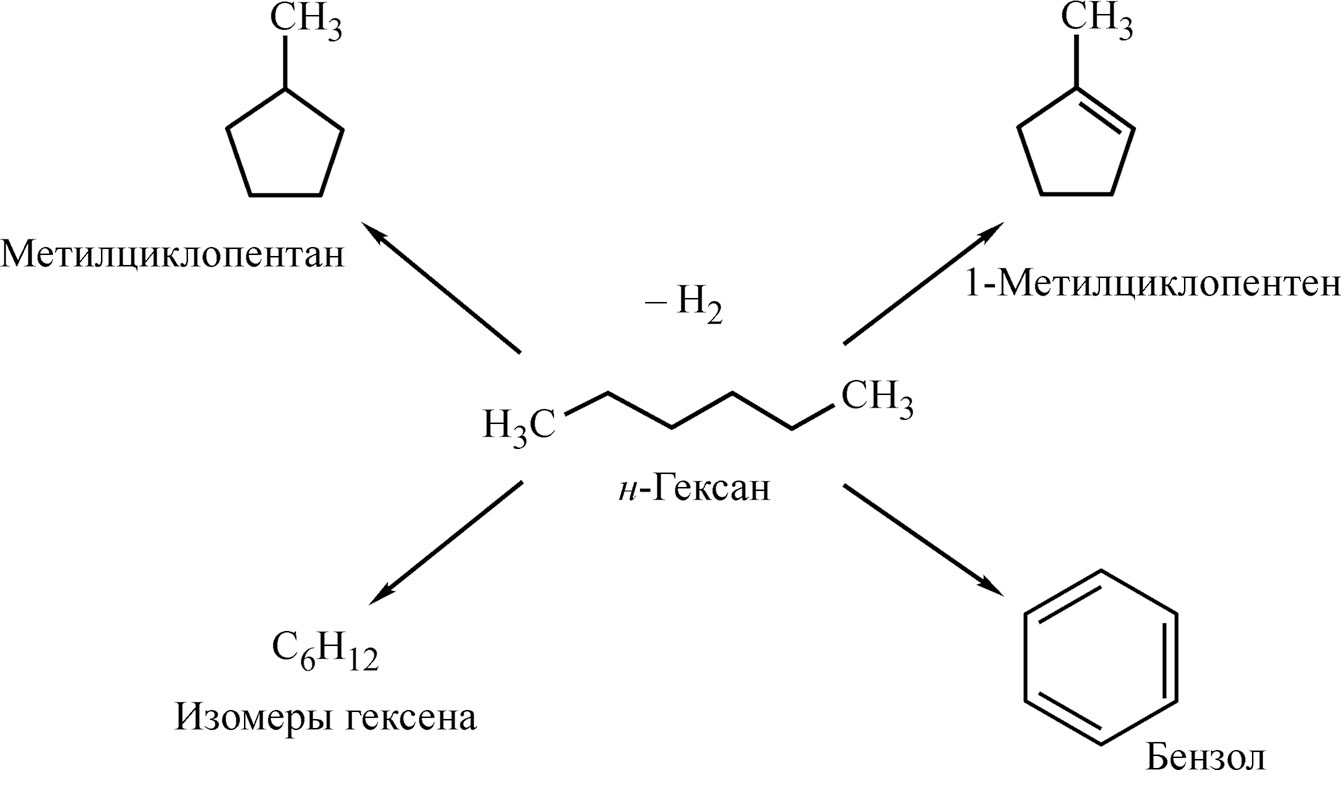Схема. Возможные направления превращения н-гексана в процессах дегидрирования и дегидроциклизации.