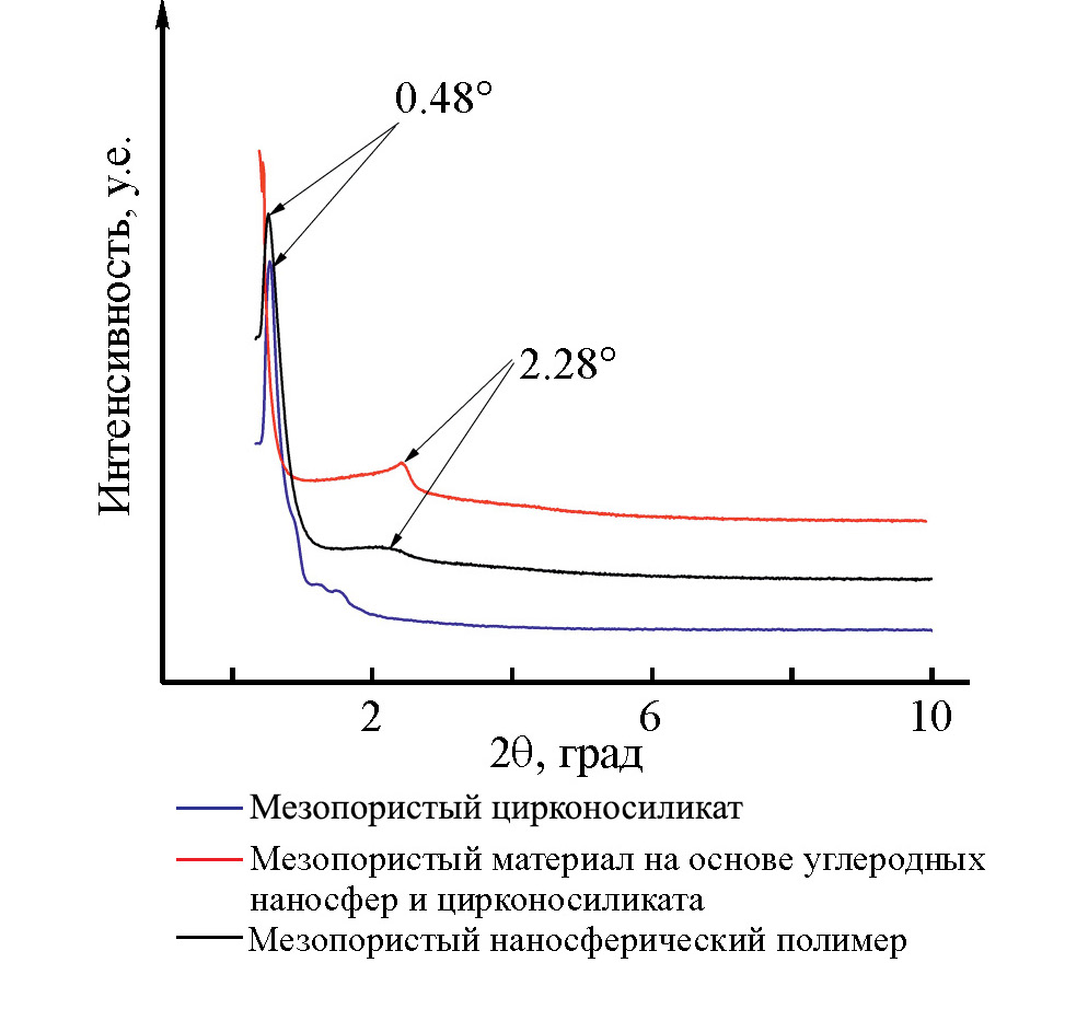 На дифрактограммах (рис. 2) носителей NSMP и m-Zr-Si обнаружены пики при 0.48° и 2.28° соответственно, которые можно проиндексировать как брэгговские рефлексы (100), что указывает на формирование упорядоченной мезоструктуры [11, 12]. Композитный материал NSMP-m-Zr-Si характеризовался наличием обоих пиков, что свидетельствует о сохранении упорядоченной структуры обоих типов материалов.