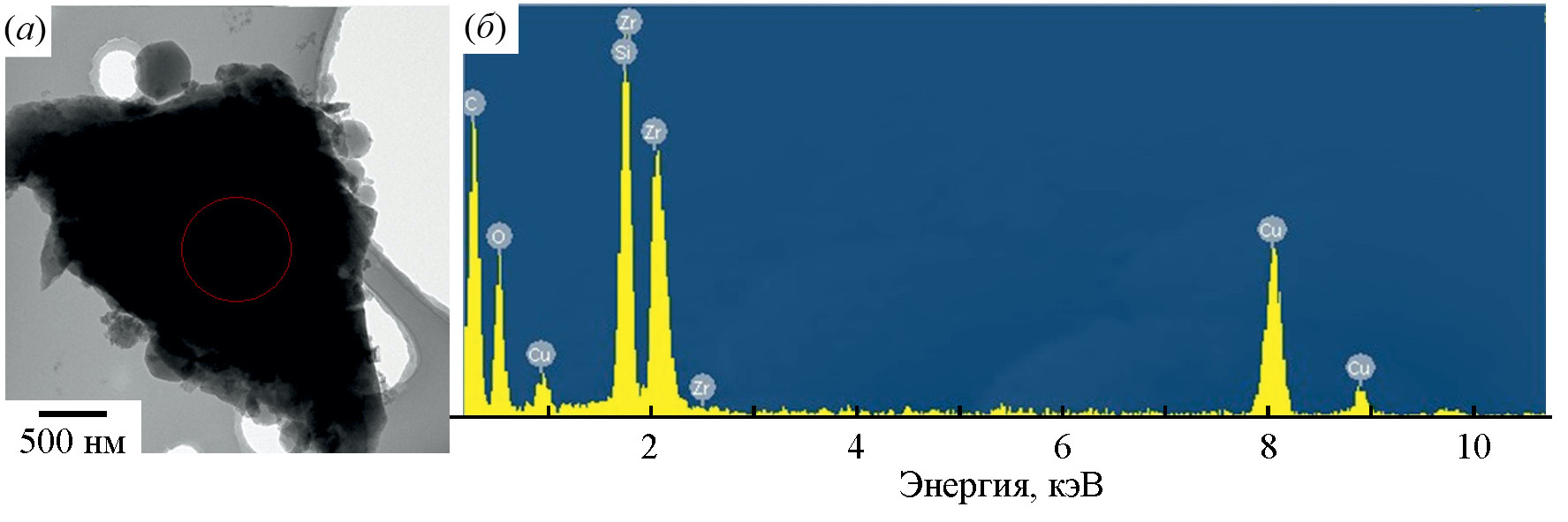 Рис. 3. Микрофотография (а) и энергодисперсионный спектр (б) мезопористого композитного материала на основе углеродных наносфер и цирконосиликата.