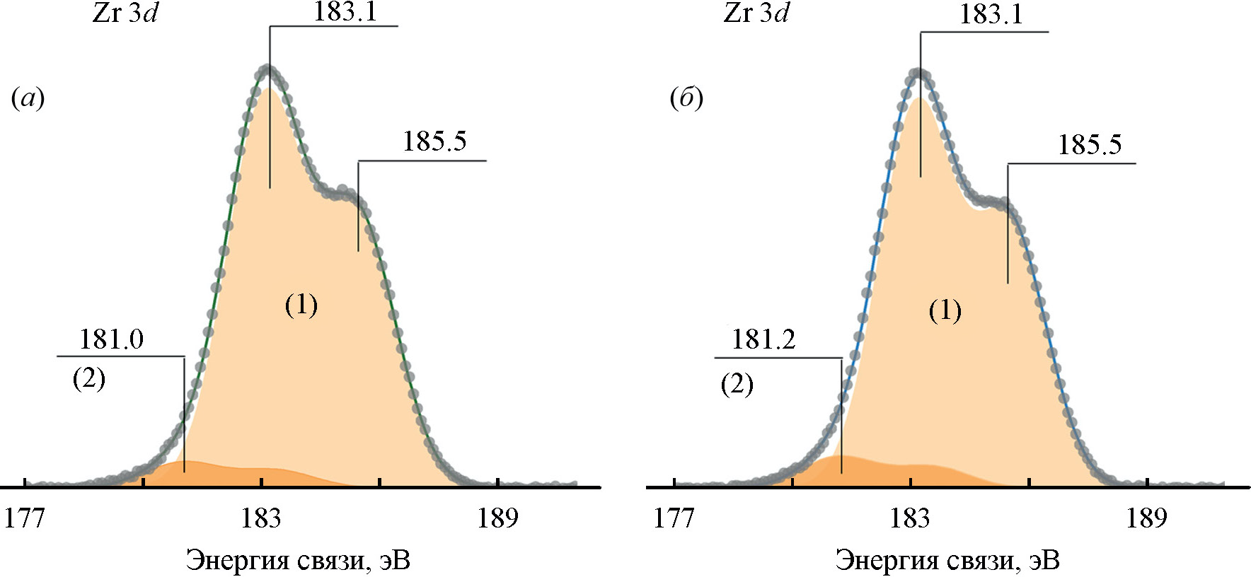 Рис. 5. Разложенные на компоненты спектры Zr3d для Ru-катализаторов, нанесенных на: (а) мезопористый цирконосиликат; (б) мезопористый материал на основе углеродных наносфер и цирконосиликата. (1) – Zr4+; (2) – Zrx+ (x ≤ 3).