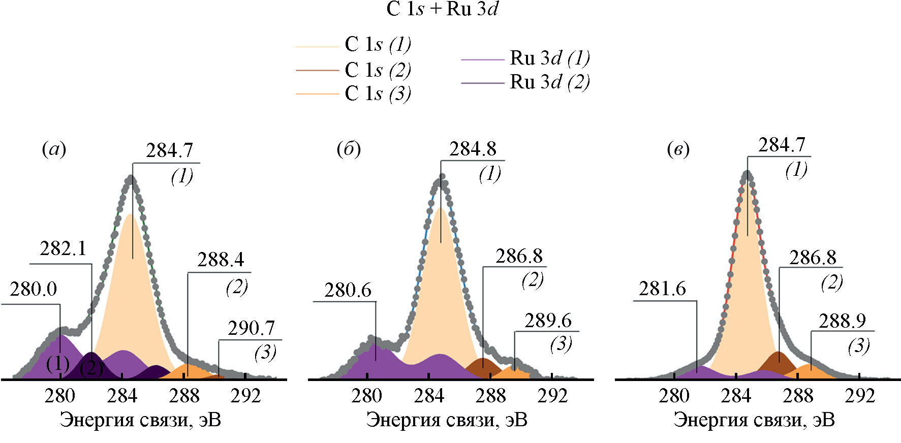 На рис. 6 представлен регион с разложенными на компоненты рентгенофотоэлектронными спектрами C1s и Ru3d для образцов. Полученная спектральная линия представляла собой хорошо различимые компоненты C1s. Наиболее интенсивная компонента (1) с максимумом пика при энергии связи ~284.8 ± 0.1 эВ может быть приписана ароматическому и алифатическому углероду [15]. Вторая по интенсивности компонента (2) характеризовалась максимумом пика 286.8–288.5 эВ, который можно также отнести к хемосорбированным слабоокисленным формам углерода (–C–OН, –C=O). Наименее интенсивная компонента C1s (3) с максимумом пика в районе 288.9–290.7 эВ указывала на присутствие окисленных форм углерода COO-типа.
