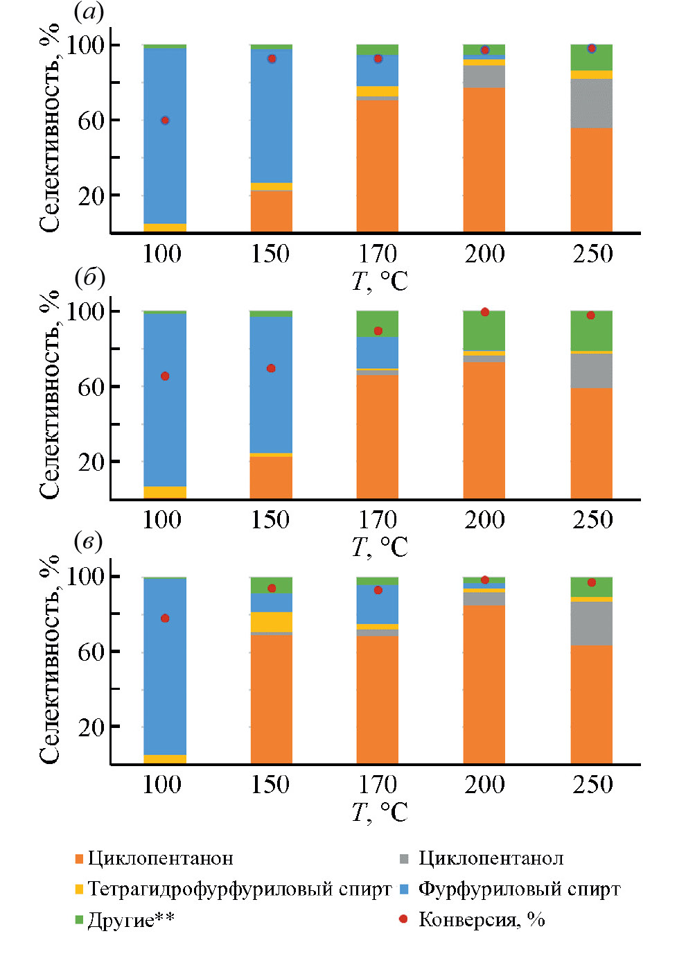 Температура оказывала существенное влияние на протекание реакции (рис. 8). При температуре 100°С наибольшая конверсия фурфурола (78%) была достигнута на катализаторе Ru–NSMP-m-Zr-Si. При температуре 150°С основным продуктом в случае катализаторов Ru–NSMP и Ru–m-Zr-Si был фурфуриловый спирт, в то время как в случае катализатора Ru–NSMP-m-Zr-Si – циклопентанон (69%). При увеличении температуры со 100 до 170°С конверсия фурфурола возрастала до 90–93% и возрастало количество образующегося циклопентанона. Наибольшая селективность образования циклопентанона (85%) достигнута в присутствии катализатора Ru–NSMP-m-Zr-Si при 200°С. С ростом температуры до 250°С для всех катализаторов в продуктах реакции обнаруживался циклопентанол, а в случае катализатора Ru–m-Zr-Si также значительное количество побочных продуктов (до 21.5%), что может быть связано с повышенной бренстедовской кислотностью неорганического носителя, способствующей реакциям полимеризации [20].