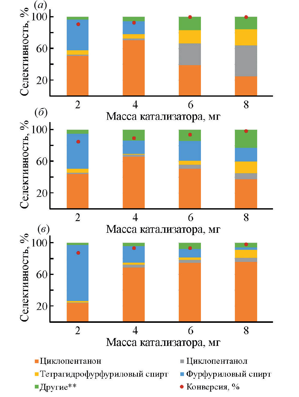 Рис. 10. Конверсия фурфурола и селективности образования продуктов его гидрирования в зависимости от массы катализатора на Ru-катализаторах, нанесенных на: (а) мезопористый наносферический полимер; (б) мезопористый цирконосиликат; (в) мезопористый материал на основе углеродных наносфер и цирконосиликата. * Условия реакции: 170°С, 3 МПа Н2, 2 ч, 50 мкл фурфурола, 2 мл воды. ** Другие: 2-метилфуран, тетрагидро-2-метилфуран, тетрагидрофурфураль, пентанол, пентандиол-1,4, 3-ацетил-1-пропанол, 2-циклопентенон, 4-гирокси-2-циклопентенон, 2-фурфурил-5-метилфуран, дифурфуриловый эфир.