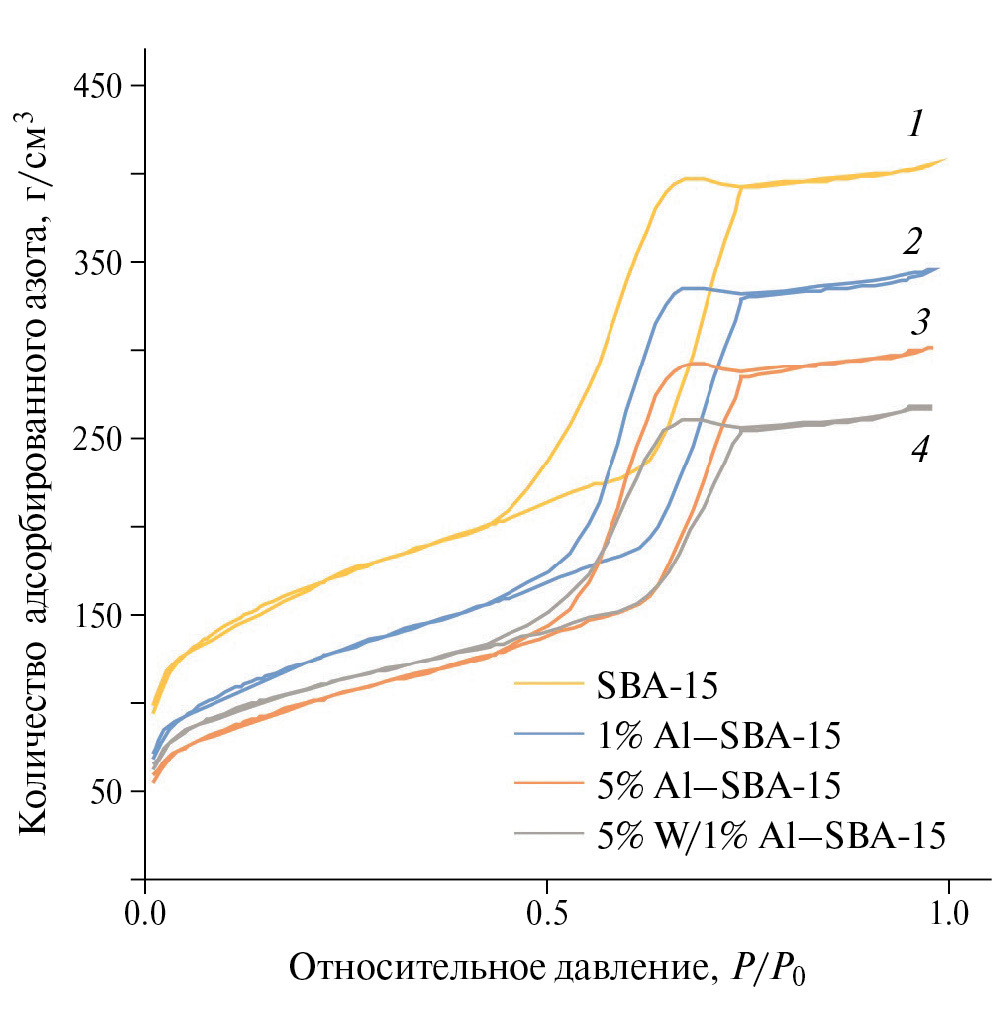 Структура синтезированных носителей с различным содержанием алюминия, а также вольфрамовых катализаторов была исследована методом низкотемпературной адсорбции–десорбции азота. Для всех катализаторов и носителя характерны изотермы IV типа с ярко выраженной петлей гистерезиса, свойственной мезопористым материалам (рис. 1), что позволяет сделать вывод о неизменности структуры носителя при нанесении металла.