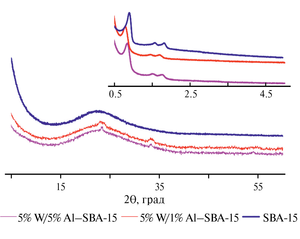 При изучении фазового состава катализаторов и носителя SBA-15 методом РФА было установлено, что в области малых углов около 1°, 1.5° и 1.8° присутствуют полосы, характерные для гексагональных пор в структуре SBA-15 с симметрией P6mm. На дифрактограмме в области углов 2θ не было обнаружено полос алюминия, что говорит о высокой дисперсии вольфрама и алюминия и отсутствии кристаллических фаз оксидов этих элементов. В области 20°–25° присутствует полоса, характерная для аморфного силиката (рис. 3), подтверждающая аморфную структуру мезопористого силиката [31, 32]; также в области 30°–33° присутствует полоса, характерная для фазы оксида вольфрама WO3 с гексагональной структурой [33].