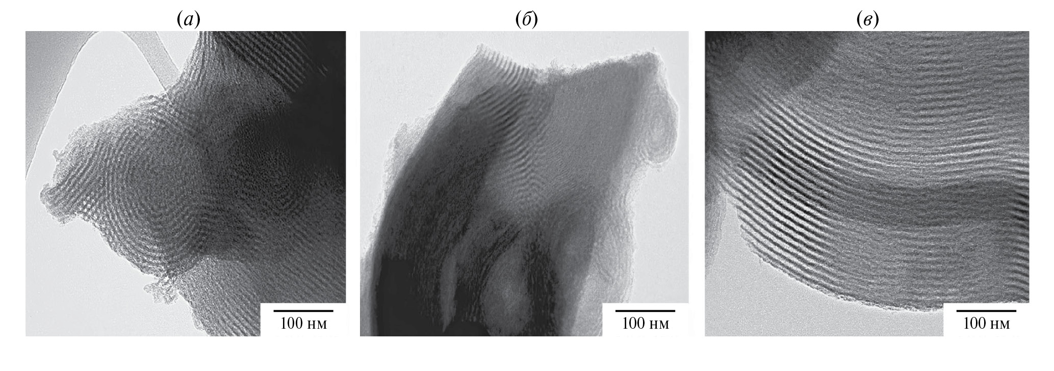 Рис. 4. Снимки ПЭМ: (а) – SBA-15, (б) – 5% W/1% Al–SBA-15 и (в) – 5% W/5% Al–SBA-15.
