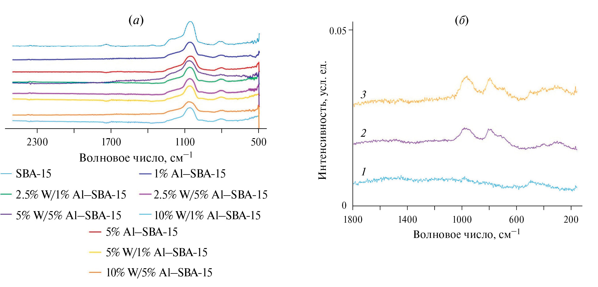 Рис. 6. ИК-Фурье (а) и КР-спектры (б) катализаторов W/Al–SBA-15 и носителя SBA-15: 1 – SBA-15; 2 – 5% W/5% Al–SBA-15; 3 – 10% W/5% Al–SBA-15.