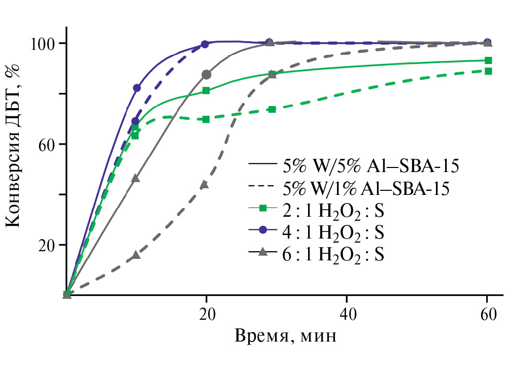 Для определения оптимального количества окислителя проводилось варьирование его концентрации от двух- до шестикратного избытка по отношению к сере. За 30 мин реакции удается достичь полного окисления ДБТ при использовании катализатора 5% W/5% Al–SBA-15 и четырехкратном избытке окислителя пероксида водорода (рис. 8); снижения количества окислителя в два раза недостаточно для достижения той же активности катализатора. Кислый катализатор обладает большей активностью благодаря более высокому содержанию центров Льюиса, а при увеличении количества окислителя в шесть раз наблюдается агрегация катализатора, что препятствует процессу окисления ввиду недоступности активных центров катализатора.