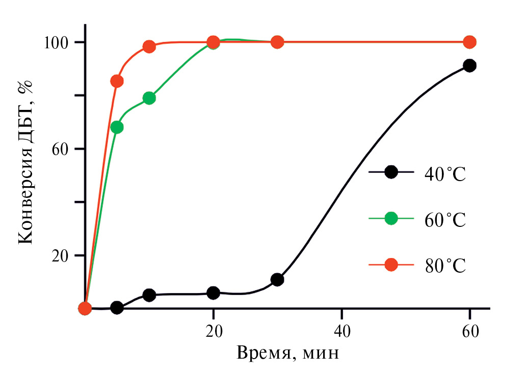 В интервале от 60 до 80°C в присутствии катализатора в количестве 0.5 мас. % возможно достичь максимальной степени превращения ДБТ всего за 20 мин (рис. 10). При снижении температуры до 40°C в течение 30 мин происходит снижение конверсии ДБТ до значения ниже 10%, что связано, вероятно, со слипанием частиц катализатора, возникновением агрегации частиц и снижением скорости диффузии субстрата в его поры. Окислитель на водной основе также может увеличить вязкость реакционной среды и способствовать слипанию частиц катализатора при температуре 40°C.