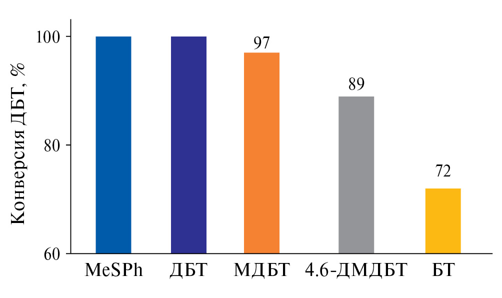 Окисление различных сернистых соединений проводили с использованием пероксида водорода в присутствии катализатора, содержащего 5% оксида вольфрама, нанесенного на 5% Al–SBA-15 (рис. 11). Замещенный ДБТ окисляется менее эффективно, чем “чистый” ДБТ, из-за наличия стерических затруднений. Наименьшая степень конверсии была достигнута при окислении бензотиофена, поскольку электронная плотность на атоме серы в этом соединении наименьшая, что и затрудняет процесс окисления [38].