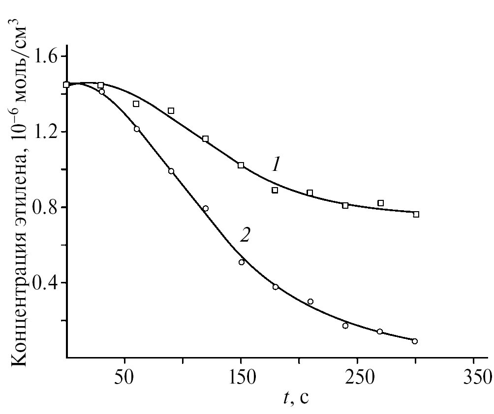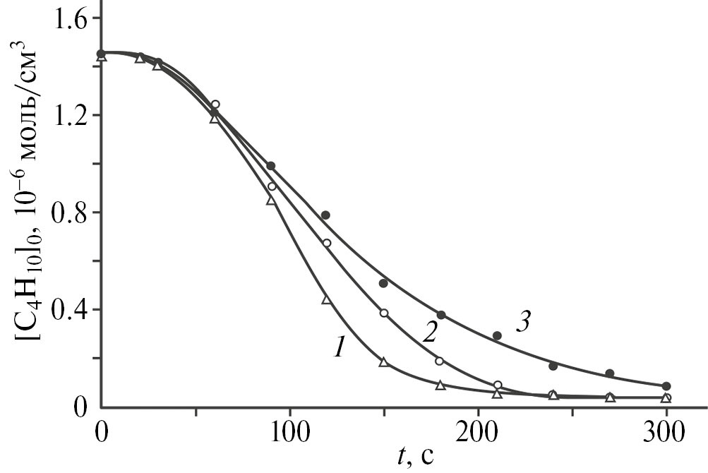 В случае отсутствия в исходной смеси этилена (N2 : O2 : C4H10 = 1 : 3 : 1) н-бутан активно окисляется. На рис. 1 представлены типичные кинетические кривые расхода н-бутана и этилена.