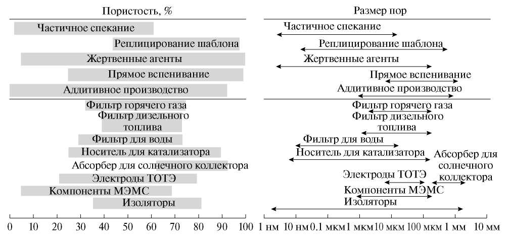 Рис. 2. Классификация пористых керамических материалов по размерам пор, областям применения и способам производства.
