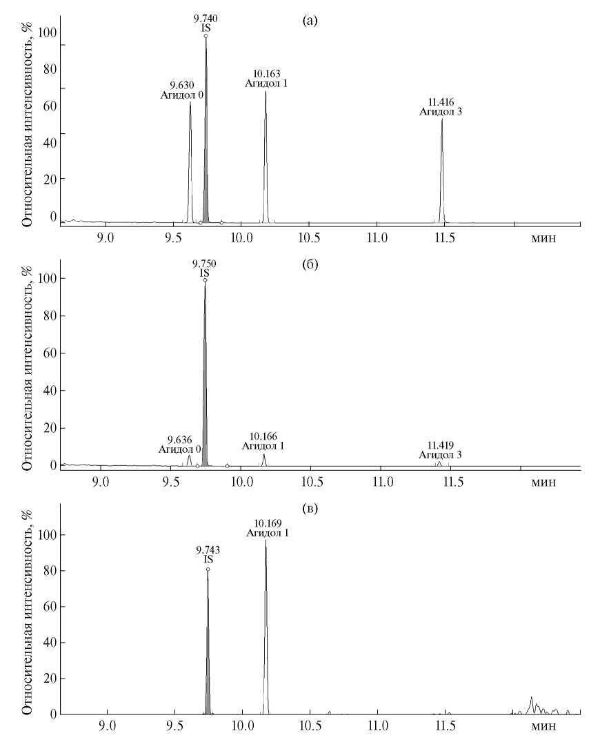 В качестве основных ионов, используемых как для детектирования, так и для количественного определения аналитов, были выбраны ионы, пики которых имеют максимальную интенсивность в масс-спектрах ионизации электронами (ИЭ) целевых соединений. В случае Агидола-0 и Агидола-1 образование этих ионов было связано с элиминированием метильной группы из трет-бутильного заместителя, а в случае Агидола-3 – иона, формирующегося в результате разрыва связи между атомом азота и бензильным положением ароматического кольца. Для подтверждения правильности идентификации использовали молекулярные ионы аналитов. Для внутреннего стандарта использовали ион-продукт элиминирования метокси-группы из молекулярного иона и сам молекулярный ион соответственно. Характеристичные соотношения интенсивностей ионов приведены в табл. 2. Следует отметить, что, несмотря на высокую воспроизводимость масс-спектров ИЭ, различия в конструкциях источников ионов и параметрах масс-анализаторов требуют определения этих величин для каждого из используемых приборов.