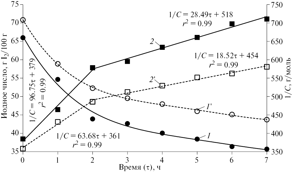 Рис. 1. Кинетические кривые термической полимеризации непредельных соединений ТСП: 1, 1´— зависимости иодного числа реакционной смеси от времени реакции при температурах 260 и 240°C соответственно; 2, 2´— зависимости обратных концентраций двойных связей в реакционной смеси от времени реакции при температурах 260 и 240°С соответственно.