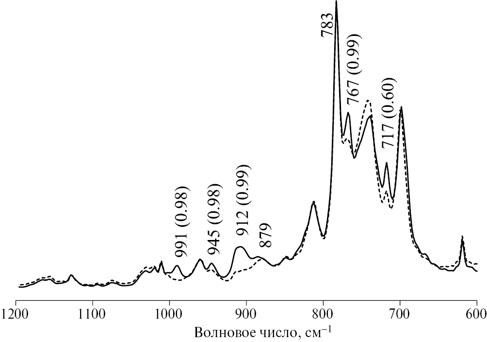 Рис. 2. ИК-спектры МНПВО ТСП в начале (сплошная линия) и после семи часов (пунктирная линия) термообработки. Над волновыми числами в скобках указаны значения коэффициента корреляции Пирсона между интенсивностями полос и иодным числом реакционной смеси.