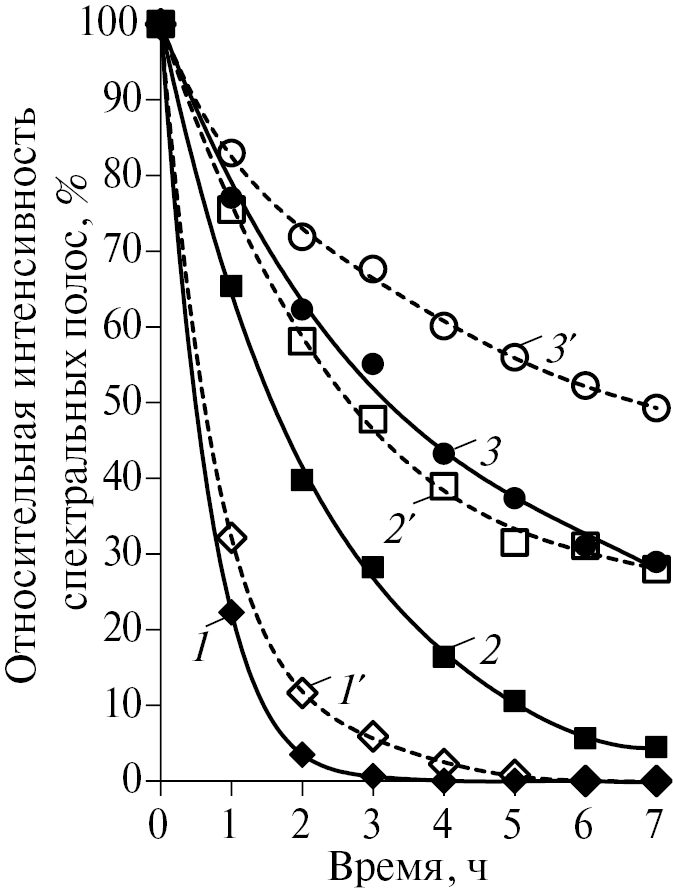 Таким образом, процесс термической полимеризации непредельных соединений ТСП протекает в две стадии, каждая из которых имеет второй порядок по реагентам. Первая стадия имеет более высокую константу скорости и длится ~2 ч. При этом энергии активации обеих стадий близки, и различие их скоростей обусловлено, прежде всего, стерическим фактором, очевидно, связанным с химической структурой реагентов, доминирующих на каждой из стадий. Для выяснения этого обстоятельства была изучена кинетика расходования различных двойных связей по изменению интенсивности соответствующих им полос δCsp2H в ИК-спектре реакционной смеси (рис. 2).