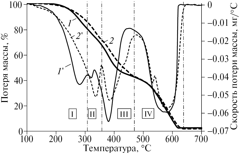 Термогравиметрический анализ (ТГА) вакуумных остатков осуществляли на приборе Mettler Toledo TGA/DSC-1/1600 HF (Швейцария) в атмосфере паро-газов (навеска 15 мг, тигель из оксида алюминия с крышкой объемом 70 мкл) в диапазоне температур 30–800°C со скоростью нагрева 5°C/мин.